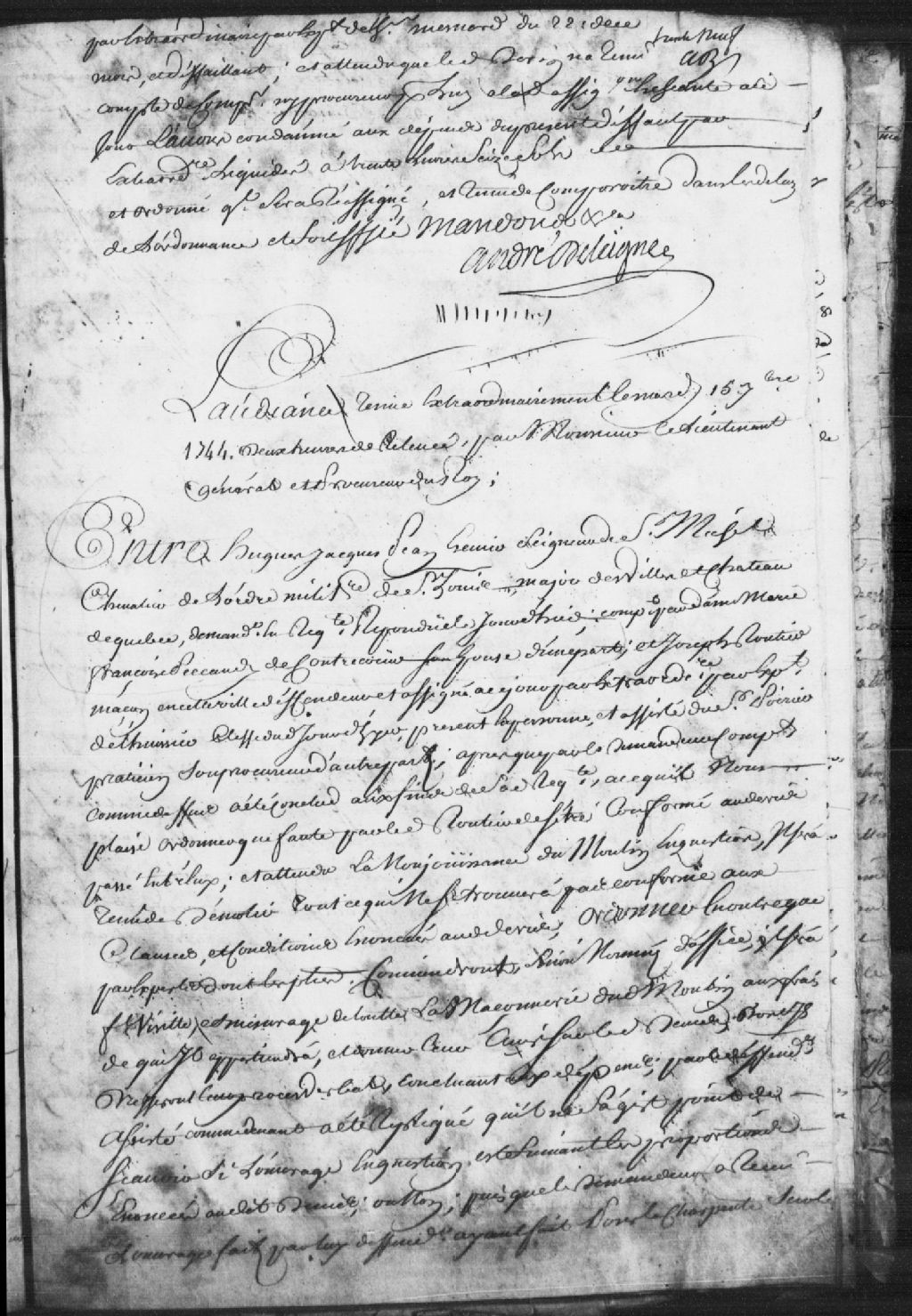Cause entre Hugues-Jacques Péan, écuyer, seigneur de Saint-Michel, chevalier de l'Ordre militaire de Saint-Louis, major des villes et châteaux de Québec, demandeur, comparant par dame Marie-Françoise Pécaudy de Contrecoeur, son épouse, et Joseph Routhier, maçon de Québec, défendeur ; il est ordonné que des experts dont les parties conviendront feront la visite et le mesurage de toute la maçonnerie du moulin dont il est question, le demandeur nomme Noël Marcoux, maître maçon, et le défendeur nomme François Moreau, maître maçon, lesquels experts dresseront un procès-verbal de leur visite