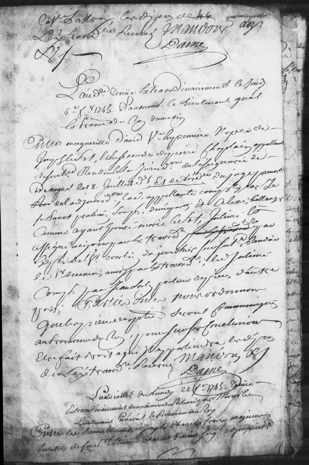 Cause entre Marguerite David, veuve en première noce du feu Joseph Lesot, et en seconde noce du feu Pierre Chaplain, appelante de la sentence rendue en la seigneurie de Beaupré le 18 juillet 1744, appelante, comparante par Jean-Claude Panet, praticien, son procureur, et Alexis Bélanger, comme ayant épousé Marie Lesot, intimé, comparant par Jean-Laurent Fortin ; il est ordonné que les pièces apportées par les parties seront communiquées au procureur du roi