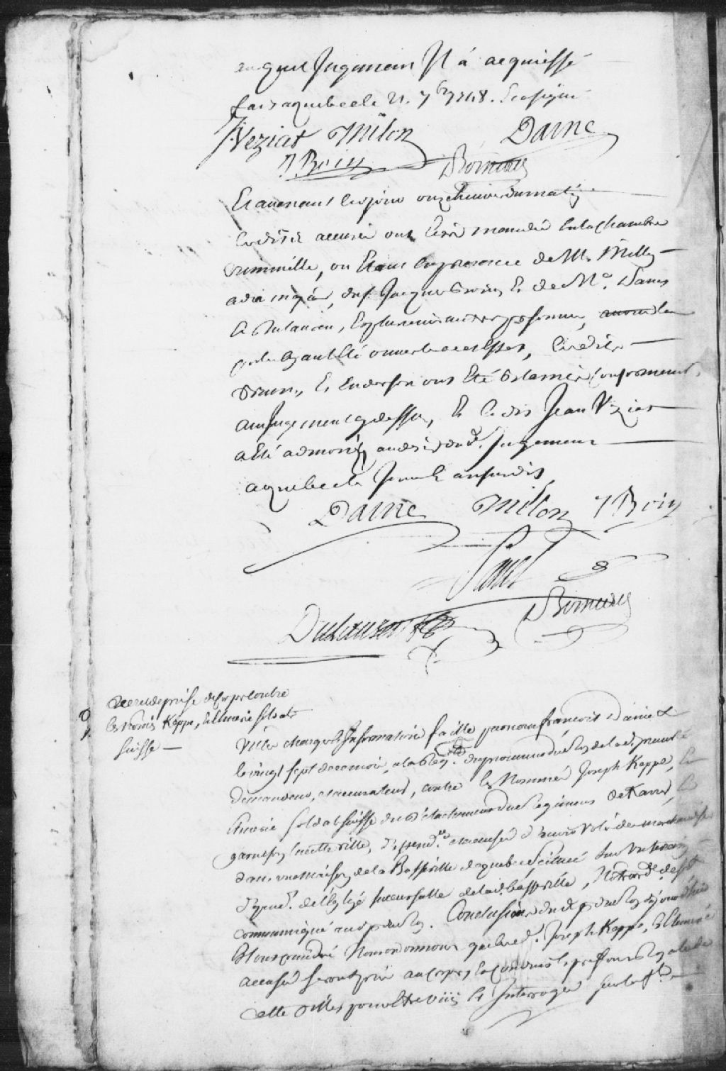 Procès contre Jean Véziat (Vézina), soldat de la compagnie Denozel (Devozel), le nommé Handerson et Christian Brun (Drouin), soldats suisses du détachement du régiment de Kares (Karre - Karer), tous prisonniers, accusés d'avoir distribué de faux ? dans le public ; arrestations, interrogatoires et informations, interrogatoires sur la sellette, récolements et confrontations ; il est ordonné que lesdits Brun et Handerson seront mandés pour être blâmés pour ladite distribution faite par eux, et que ledit Véziat sera admonesté (réprimandé) ; suit le prononcé de la sentence audits Brun et Véziat, 24 septembre 1748, Archives nationales à Québec, Fonds Prévôté de Québec, (03Q,TL1,S11,SS1,D86,P58).