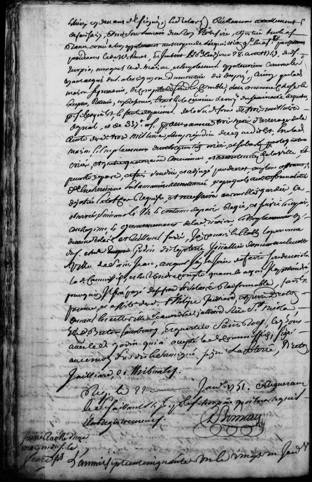 Saisie d'une maison sise rue Champlain, en vertu de certains contrats passés devant les notaires Pinguet et Rageot, le 14 octobre 1743, et de la sentence rendue en la Prévôté de Québec, le 13 novembre 1750, à la requête du sieur Nicolas Fauconnier, négociant au Havre de grâce, stipulant par le sieur François Havy et Jean Lefebvre (Lefèvre), négociants de Québec, faute de paiement d'une somme de 6 820 livres par le sieur et la dame de Lettre (Delestre), obligés solidairement ; mention du transport de François Thibault, huissier du Conseil, assisté de Philippe Jaillard et Pierre Breton, huissiers de la Prévôté de Québec, en ladite maison ; description de l'emplacement et maison, et noms de voisins ; Jean Pascal Taché (Tachet), négociant demeurant rue Sous-le-Fort, accepte la commission