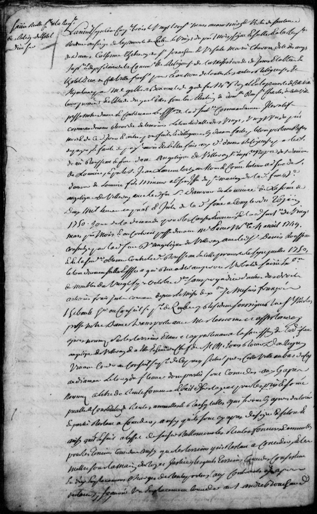 Saisie d'un terrain sis au bas du Cap Diamant, le long du fleuve, appartenant à la succession de ladite feue Villeray, en vertu de la sentence rendue en la Prévôté de Québec, le 20 mars 1753, à la requête de Catherine Thibierge de Saint-Joachim et d'Ursule-Marie Charon (Charron) dite Desanges (des Anges), supérieure et dépositaire de la communauté des Religieuses de la Miséricorde de Jésus, établie en l'Hôtel-Dieu de Québec, faisant pour et au nom de toutes les religieuses, stipulant par maître Gilbert Boucault de Godfus, notaire royal de la Prévôté de Québec, leur procureur, faute de paiement d'une somme de 2 000 livres par le sieur Denis Rousseau et feue Angélique de Villeray, son épouse, veuve en premières noces du sieur Damour de Louvière (Delouvière), et par le sieur Jean-Laurent Lortie, au nom et comme tuteur ad hoc (pour une fin particulière) du sieur Damour de Louvière (Delouvière), fils mineur et absent, issu du mariage entre ladite feue Villeray et le feu sieur Damour ; mention d'un contrat passé devant maître Panet, notaire, le 4 avril 1749 ; mention d'une sentence de la Prévôté contre ledit Rousseau, en date du 7 juillet 1750 ; mention du transport de François Thibault, huissier du Conseil, sur ledit terrain ; description dudit terrain et noms de voisins ; mention de plusieurs autres emplacements, noms des propriétaires et dates de concession ; Martial Valet, brigadier des gardes du Domaine du Roi en Nouvelle-France, demeurant rue et quartier Saint-Roch à Québec, accepte la commission, Joseph Méthot, boucher demeurant rue et quartier Saint-Roch, et Gabriel Renaud, tailleur d'habits demeurant rue Saint-Nicolas, sont témoins