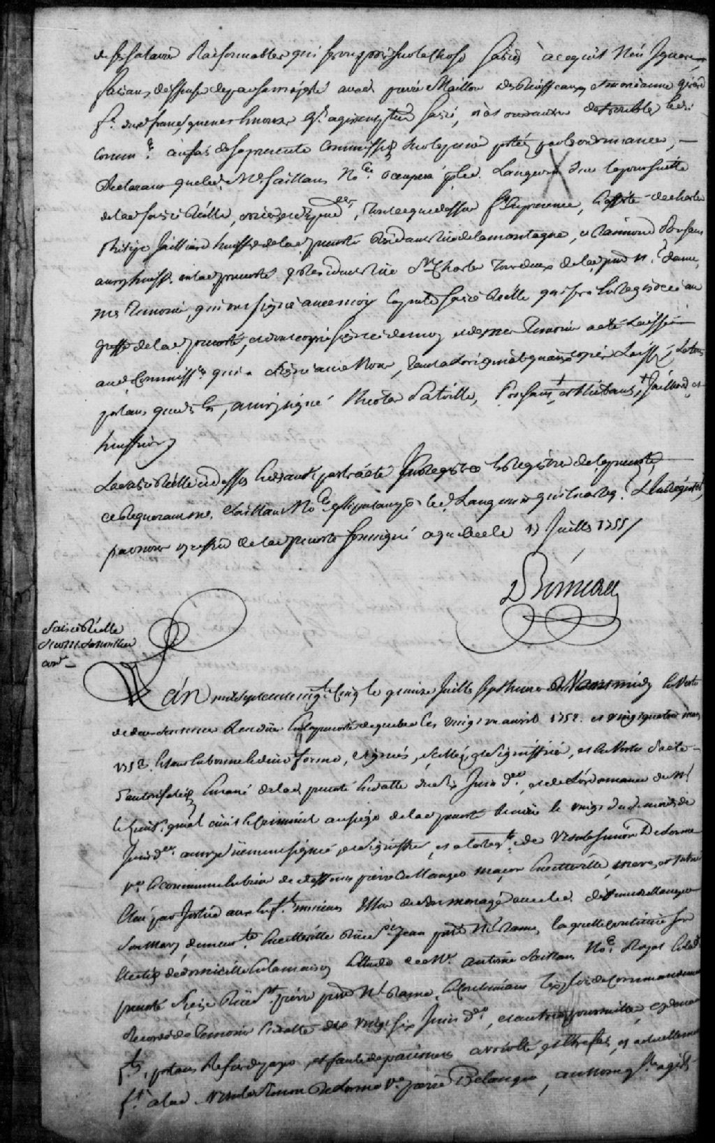 Saisie d'un emplacement sis rue Saint-Flavien, en vertu des sentences rendues en la Prévôté de Québec le 21 avril 1752 et le 24 mars 1753 ; mention d'un acte d'autorisation en date du 6 juin 1755 et d'une ordonnance en date du 20 juin 1755 ; laquelle saisie faite à la requête d'Ursule-Simon Delorme, veuve et commune en biens de feu Pierre Bélanger, de son vivant maçon de Québec, ladite Delorme, demeurant rue Saint-Jean, faisant comme mère et tutrice de leurs enfants mineurs, faute du paiement par maître Nicolas LaNoullier, conseiller du Roi au Conseil supérieur et garde sceaux en Nouvelle-France, d'une somme de 2 630 livres et 17 sols ; mention du transport de François Thibault, huissier du Conseil demeurant rue Saint-Joachim, audit emplacement ; description dudit emplacement, avec noms des voisins ; Nicolas Patoile dit Desrosiers, bourgeois demeurant rue Mont-Carmel à Québec, accepte la commission, Raymond Poussan (Ponssan), huissier royal de la Prévôté demeurant rue Saint-Charles, et Philippe Jaillard, huissier royal de la Prévôté demeurant rue de la Montagne, sont témoins