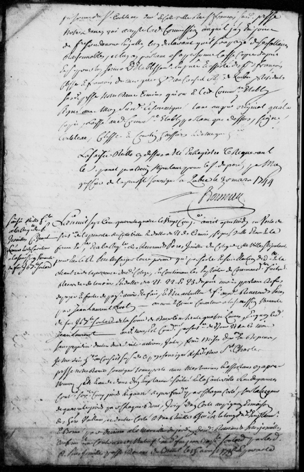 Saisie d'un emplacement sis rue des Pauvres, en la Haute-Ville de Québec, suivant une sentence rendue en la Prévôté de Québec le 21 avril 1744, à la requête des Révérends Pères Jésuites du collège de Québec, le révérend père [Floquet], leur procureur stipulant pour eux, faute du paiement d'une somme de 234 livres par Jean-Laurent Lortie, curateur à la succession vacante de feu Jean-Baptiste Soulard (Soullard), ledit paiement de la somme de 234 livres ; mention du transport du huissier, description de l'emplacement, noms des voisins, mention d'une maison détruite dont il ne reste que des vestiges ; ordonnance à l'effet que ledit emplacement sera vendu par quatre criées ; Maurice Couteleaux, voisin dudit emplacement, accepte la commission, François Dumergue, huissier demeurant sur la rue Saint-Louis en la paroisse Notre-Dame, et Michel Jourdain, maçon demeurant rue De Meulles, sont témoins, 24 avril 1744, Archives nationales à Québec, Fonds Prévôté de Québec, (03Q,TL1,S11,SS1,D87,P5).