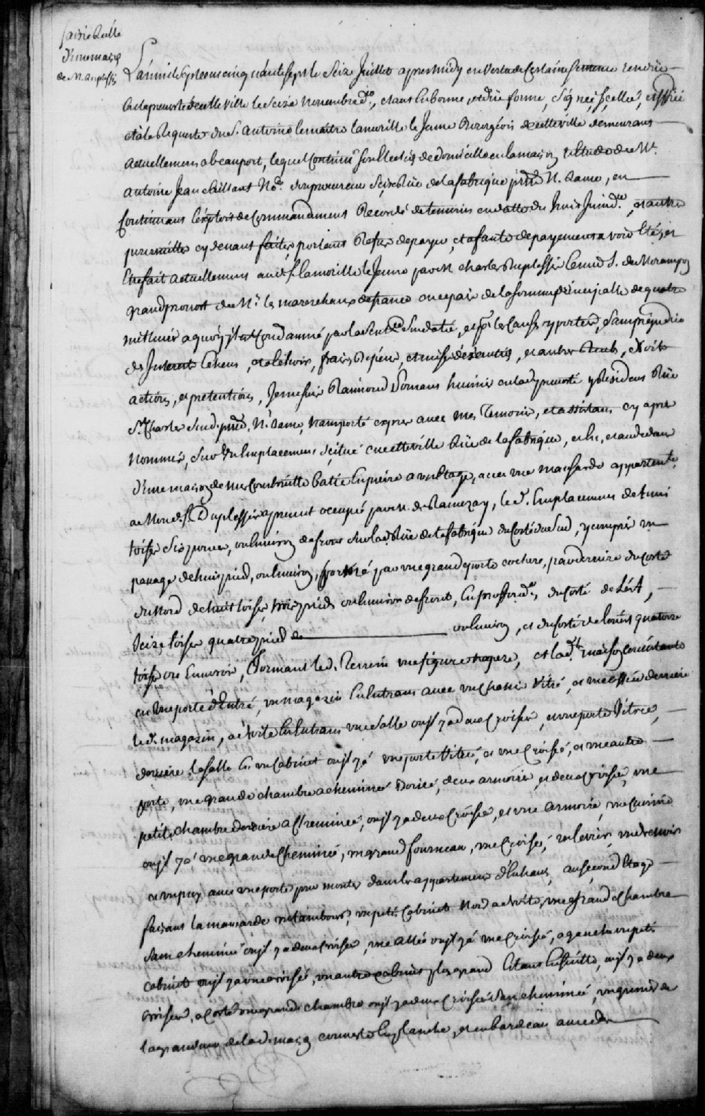 Saisie d'un emplacement et d'une maison sis rue de la Fabrique, en vertu de la sentence de la Prévôté rendue le 16 novembre 1756, à la requête du sieur Antoine Lemaître Lamorille le jeune, bourgeois de Québec demeurant à Beauport, faute du paiement par Charles Duplessis, sieur de Morampont, grand prévôt de messieurs les maréchaux de France, d'une somme de 4 000 livres ; mention du transport de Raymond Ponsant (Ponssant), huissier royal de la Prévôté de Québec, audit emplacement ; description dudit emplacement et de la maison, et noms de voisins ; Mathieu Hyanvens (Hianveu), demeurant au faubourg Saint-Henri en la paroisse Notre-Dame de Québec, accepte la commission, François Clesse, huissier au Conseil demeurant rue Saint-François et Charles-Philippe Jaillard, huissier de la Prévôté demeurant rue de Lavallée, en la paroisse Notre-Dame de Québec, sont témoins, 16 juillet 1757, Archives nationales à Québec, Fonds Prévôté de Québec, (03Q,TL1,S11,SS1,D87,P60).