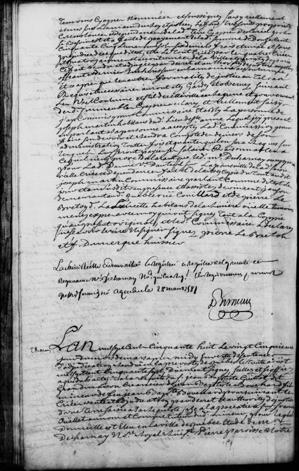 Saisie d'une terre sise en la seigneurie de Lapocatière (Pocatière) en la paroisse de Sainte-Anne, en vertu de la sentence d'adjudication rendue en la Prévôté de Québec, le 30 août 1757, à la requête de Jean-Baptiste Guillot dit Grandmaison, créancier de Jean-Baptiste Bouchard, fils mineur du feu Jean-Baptiste Bouchard, ladite adjudication concernant une terre sise à Lapocatière (Pocatière) saisie sur François Ouellet, au nom et comme tuteur dudit mineur, faute de paiement par Joseph Gagnon, habitant de Lapocatière (Pocatière), d'une somme de 600 livres restant du paiement de la somme de 3 000 livres, prix total de ladite adjudication ; mention du transport de François Dumergue, huissier au Conseil, sur ladite terre ; description de ladite terre et noms de voisins ; Jacques Miville dit Deschênes (Deschesnes), habitant de Lapocatière (Pocatière), accepte la commission, Vincent Janson, demeurant rue Couillard à Québec, et Jean Dam (Daine) dit LaFontaine, marchand demeurant en la paroisse Sainte-Anne, sont témoins