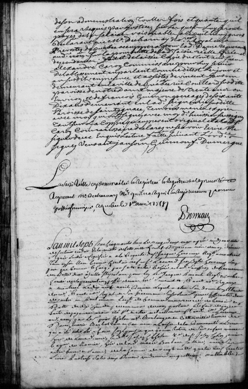 Saisie d'une maison sise rue du Sault-au-Matelot, ladite maison actuellement occupée par ledit sieur Chalou, en vertu de la sentence de la Prévôté rendue le 9 mai 1758 ; laquelle saisie faite à la requête du sieur Jacques Hervieux, négociant de Montréal, tant en son nom comme héritier du feu sieur Léonard-Jean-Baptiste Hervieux, son père, que comme faisant pour les autres cohéritiers en ladite succession, stipulant par Jacques Perrault, négociant de Québec, faute de paiement d'une somme de 20 430 livres, 14 sols et 21 deniers par le sieur Pierre Chalou, maître boulanger de Québec, et de dame Marie Barbot (Barbeau), tant en son nom à cause de la communauté de biens qui a été entre elle et son époux, que comme tuteur de ses enfants mineurs, héritiers de leur mère, la demoiselle Josèphe Chalou, veuve de feu Joseph LeRoy, de son vivant capitaine de navire, ladite Marie Barbeau, sa mère, avec ses autres frères et soeurs ; mention du transport de Raymond Ponsant, huissier de la Prévôté, en ladite maison ; description de la maison et noms de voisins ; François Dumergue, huissier au Conseil demeurant rue Du Parc en la paroisse Notre-Dame de Québec, accepte la commission, Charles-Philippe Jaillard, huissier de la Prévôté demeurant rue Saint-François, et Mathieu Lionneux (Lyonnais), patricien demeurant rue Saint-Charles, sont témoins