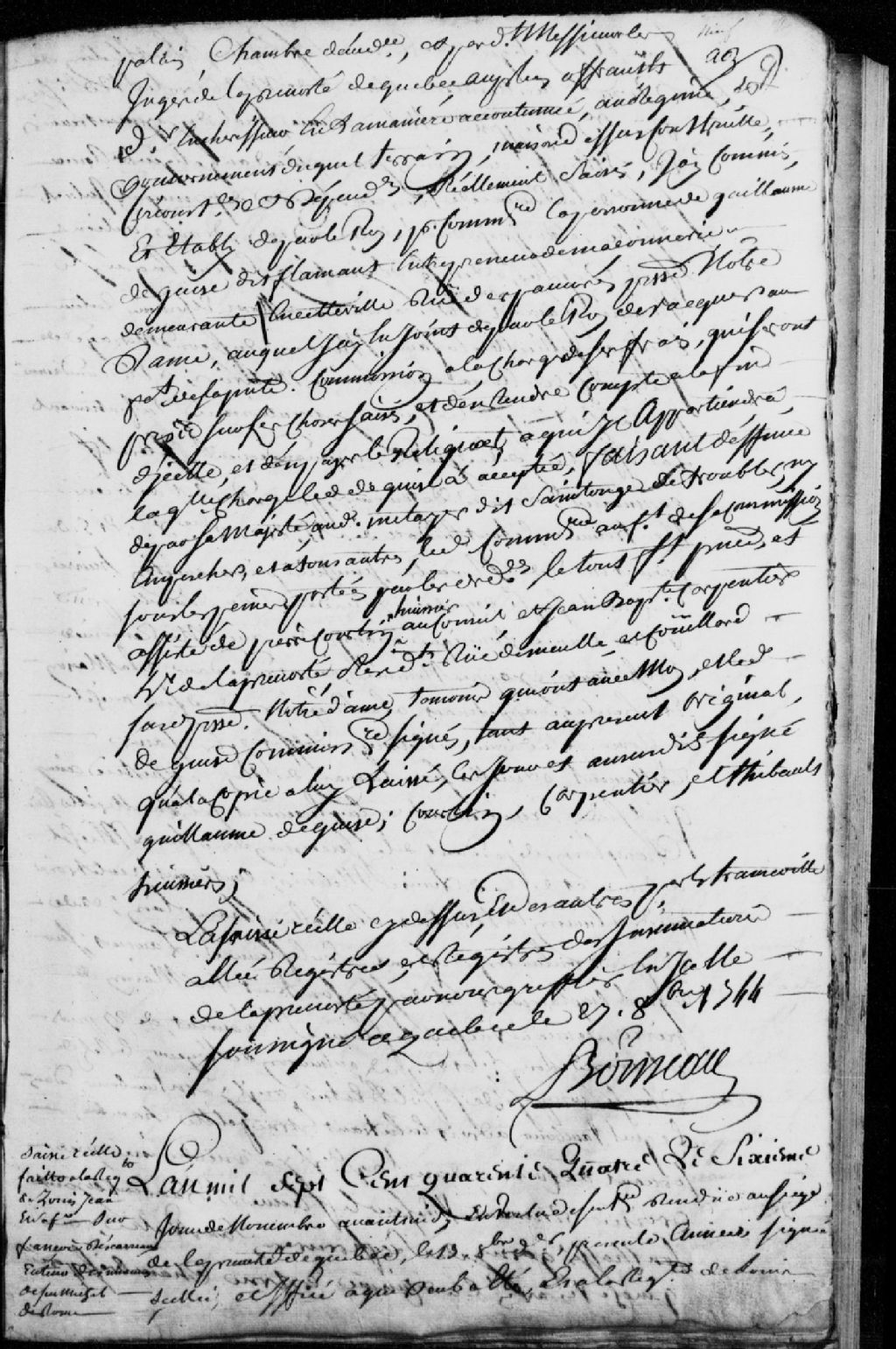 Saisie d'un emplacement et maison sis rue Champlain, suivant une sentence rendue en la Prévôté de Québec le 13 octobre 1744, à la requête de Louis Jean et Angélique Derome, son épouse, faute de paiement par François Derome Descarreaux, au nom et comme tuteur des enfants mineurs du second mariage de feu Michel Derome et de Louise Métivier ; mention du transport de Pierre Courtin, huissier au Conseil supérieur de Québec, en la maison et héritage dudit feu Derome et de ladite Métivier, sis rue Champlain ; ordonnance à l'effet que lesdits emplacement et maison seront vendus par quatre criées ; Joseph Gervais, habitant de Québec demeurant rue Champlain, accepte la commission, Pierre Pilote, huissier au Conseil supérieur en Nouvelle-France et Laurent-Sébastien Tesson?, sont témoins, 6 novembre 1744, Archives nationales à Québec, Fonds Prévôté de Québec, (03Q,TL1,S11,SS1,D87,P8).