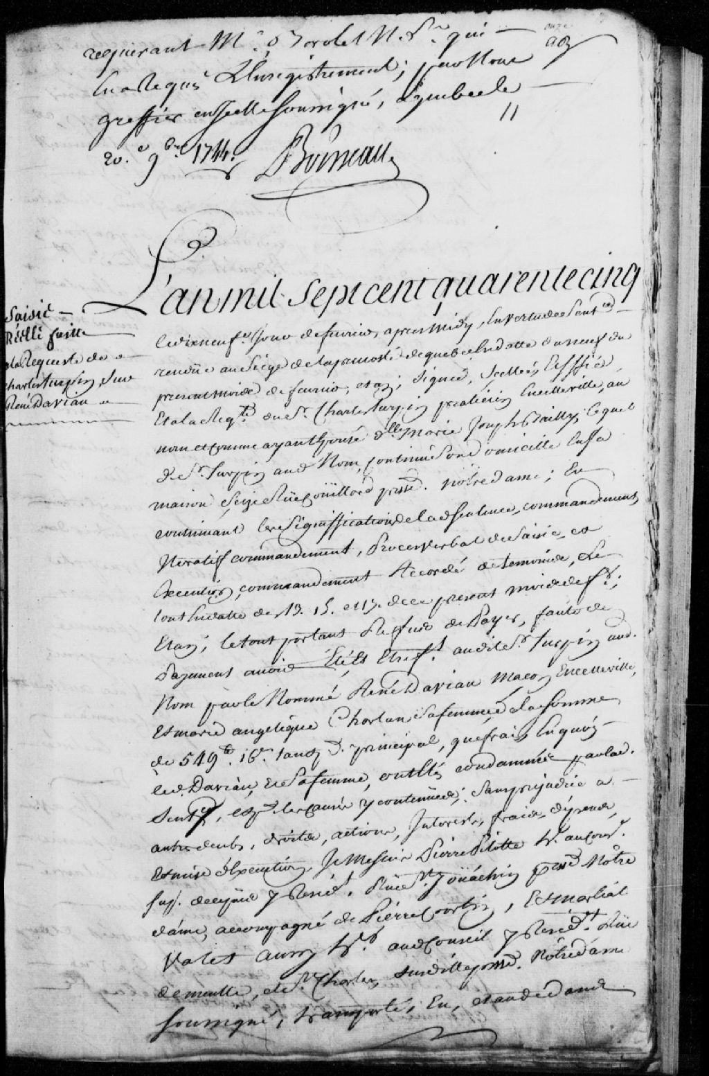 Saisie d'une maison et d'un terrain appartenant à René Daviau, maçon de Québec, et son épouse, sis à Québec dans le quartier Saint-Jean, suivant une sentence rendue en la Prévôté de Québec le 9 février 1745, à la requête du sieur Charles Turpin, praticien de Québec, au nom et comme ayant épousé Marie-Josèphe Bailly, faute de paiement par René Daviau et Marie-Angélique Charland, son épouse, d'une somme de 549 livres et 16 sols ; mention du transport de Pierre Pilote, huissier au Conseil supérieur en Nouvelle-France, audit emplacement ; description de l'emplacement et maison, et noms des voisins ; ordonnance à l'effet que la maison et le terrain seront vendus par quatre criées ; Maurice Couteleau, demeurant rue Saint-François en la paroisse Notre-Dame de Québec, accepte la commission, Pierre Courtin et Martien Valet, huissiers audit Conseil, sont témoins