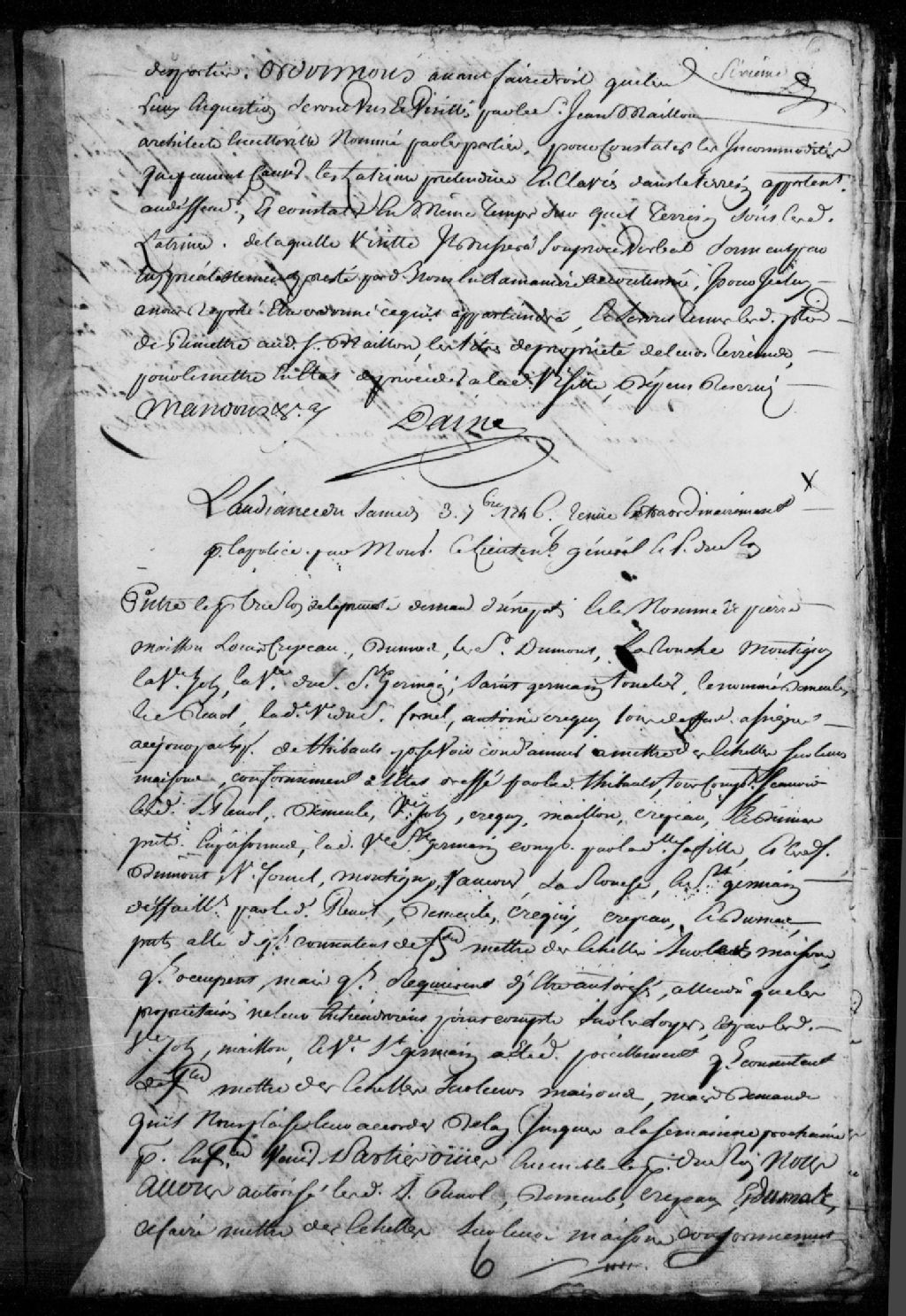 Procès contre les nommés Pierre Mailloux, Louis Crespeau (Crépeau), Dumont, le sieur Dumont, LaRouche, Montigny, la veuve Joly (Jolie), la veuve du sieur Saint-Germain, Saint-Germain, Demeule, le sieur Révol, la veuve du sieur Fornel, Antoine Crequy (Créquis), tous défendeurs, pour se voir condamnés à mettre des échelles sur leurs maisons ; il est ordonné que les nommés feront mettre des échelles sur leurs maisons
