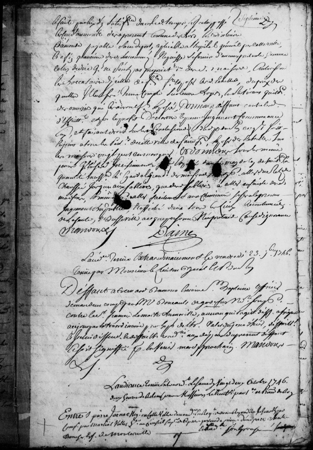 Cause entre Pierre Jarnac, négociant de Québec, demandeur, comparant par Martial Vallet (Valet), huissier au Conseil supérieur en Nouvelle-France, et Charles Boucher, de Montarville et son épouse, défendeurs, comparant par Marianne Douville, fondée de leur pouvoir, à propos d'une promesse en date du 8 octobre 1745 ; les défendeurs sont condamnés à payer au demandeur la somme de 1 940 livres et 17 sols, avec intérêts et dépens liquidés à 16 livres