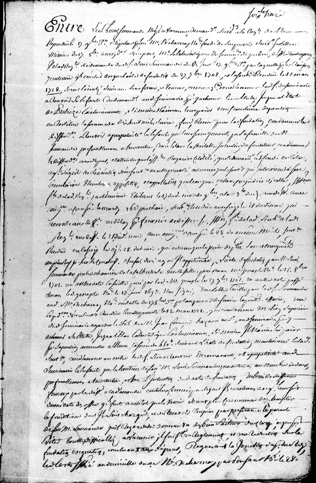 Cause entre le sieur Louis Soumande, négociant à Varenne, demandeur, stipulant par maître Decharnay, notaire fondé de son pouvoir par lettre missive en date du 17 octobre 1758, et les Ecclésiastiques du Séminaire de Québec, défendeurs ; mention de l'acte de fondation passé devant maître Genaple, notaire, le 27 septembre 1702, et d'un autre acte passé devant ledit Genaple, le 17 juin 1693 ; mention des sentences du 12 mars 1728, du 21 novembre 1728 et du 28 novembre 1728 ; mention des articles 8 et 9 de la déclaration du Roi en date du 5 juillet 1717 ; il est ordonné que la sentence du 12 mars 1728 sera exécutée selon sa forme et teneur, lesdits sieurs du Séminaire sont condamnés à recevoir le fils du demandeur dans ledit Séminaire afin que ce dernier achève ses études jusqu'à l'état ecclésiastique, faute de quoi lesdits défendeurs devront payer 450 livres de pension annuelle pour chacun des deux enfants qu'ils doivent prendre, lesdits enfants seront présentés par les héritiers Soumande, et lesdits défendeurs sont condamnés aux dépens liquidés à 39 livres