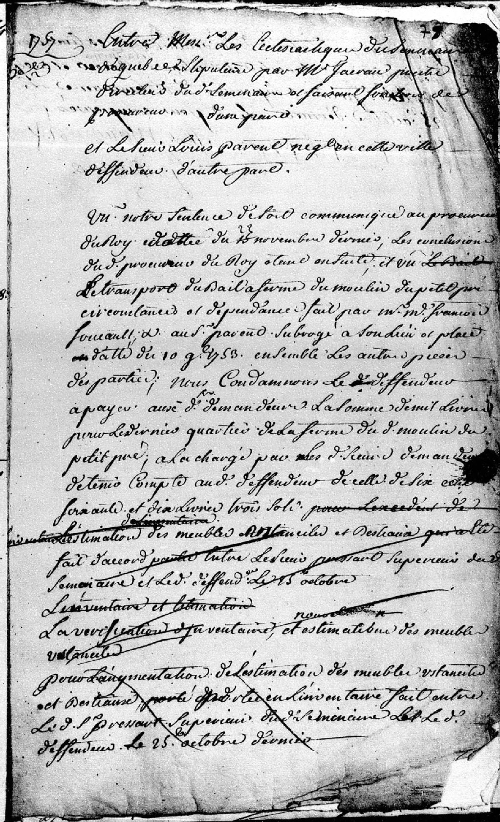 Cause entre les Ecclésiastiques du Séminaire de Québec, stipulant par maître Jacquereau, prêtre et directeur dudit Séminaire, demandeur, et le sieur Louis Parent, négociant de Québec, défendeur ; mention d'un bail à ferme du moulin du Petit Pré, fait par maître François Foucault au sieur Parent, le 10 novembre 1753 ; une sentence est prononcée et ledit défendeur est condamné à payer au demandeur la somme de 1000 livres