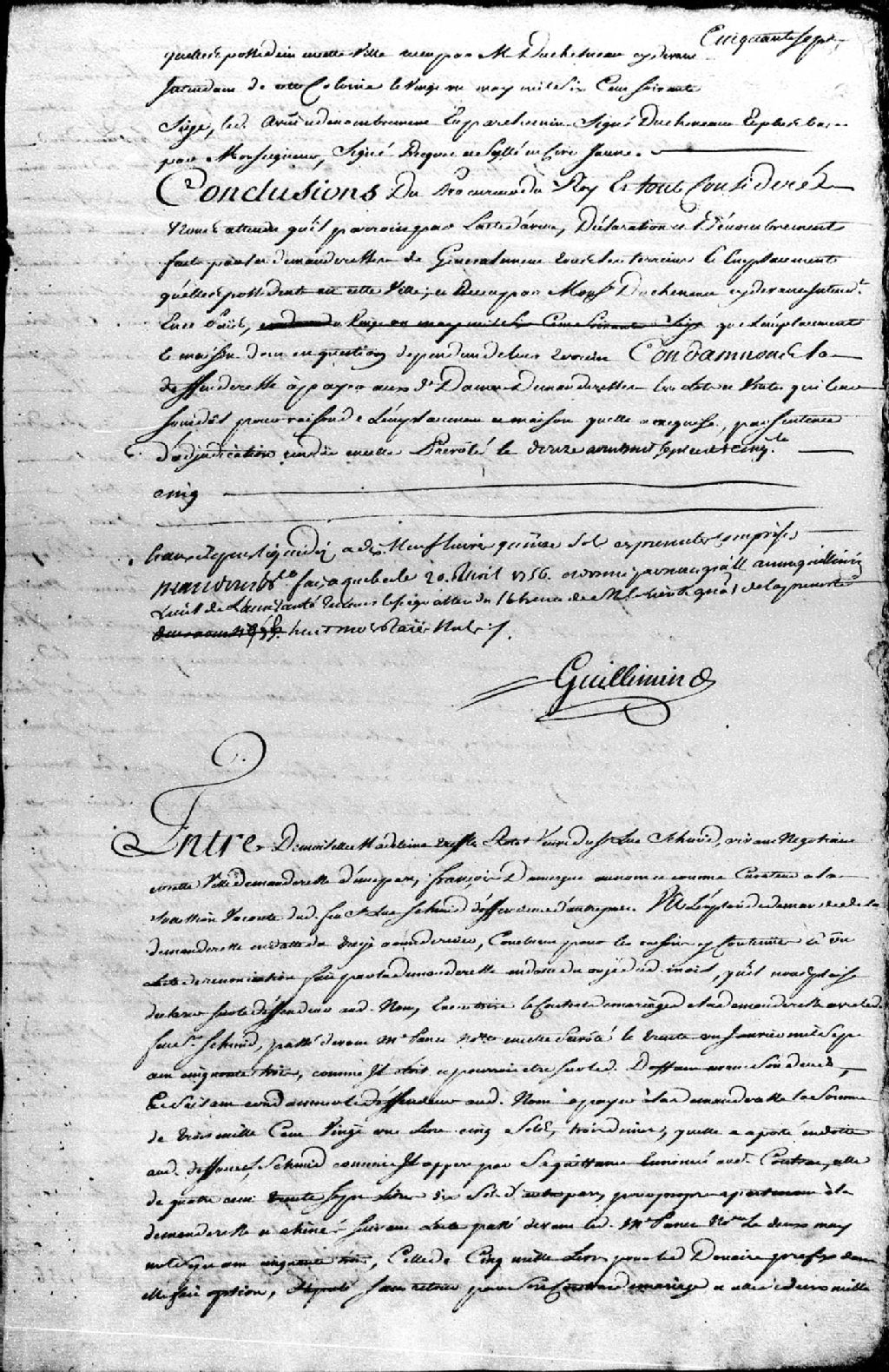 Cause entre Madeleine Trefflé Rotot, veuve du feu sieur Luc Schmit (Schmidt), de son vivant négociant de Québec, demanderesse, et François Dumergue, au nom et comme curateur de la succession vacante dudit défunt, défendeur, à propos de la restitution d'un montant donné en dot et mentionné au contrat de mariage de la demanderesse ; mention du contrat de mariage de la demanderesse passé devant maître Panet, notaire, en date du 31 janvier 1753 ; mention d'un acte de renonciation en date du 11 juillet 1755 ; mention d'une sentence en date 17 août 1755 ; mention d'un acte passé devant maître Panet, notaire, en date du 2 mai 1753, dans lequel sont mentionnés maître Jacques Imbert, trésorier de la Marine et son épouse, le sieur Dupont et son épouse, Jean Toupin et Germain Mailloux ; il est ordonné que ledit défendeur audit nom paiera la somme dont il est question à la demanderesse, avec indemnités et intérêts, en plus des dépens liquidés à 26 livres