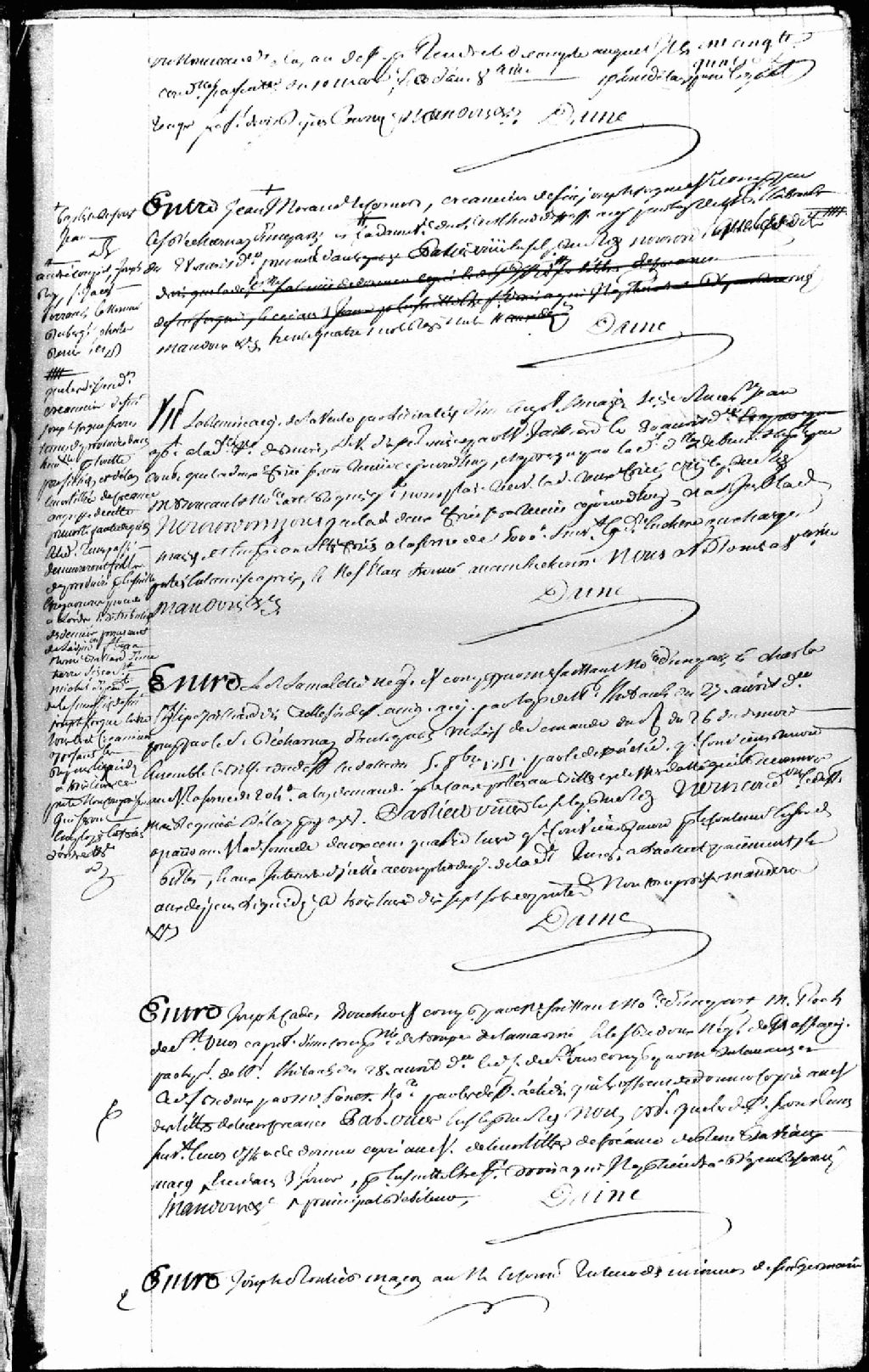 Cause entre Jean-Baptiste Dufour, Jean Morand et consorts, créanciers du feu Joseph Forgues, demandeurs, comparants par le sieur Decharnay; et la veuve du feu sieur Berthier, André Coupel (Coupiet), Joseph Duroy, Jacques Perrault, le nommé Duberger, Charles Denis, défendeurs, ordre auxdits créanciers de produire les titres de créances, pour ensuite procéder à la distribution des deniers provenant de l'adjudication fait au nommé Ballard, d'une terre sise à Saint-Michel, dépendante de la succession du feu Joseph Forgue (texte en marge), 2 mai 1752, Archives nationales à Québec, Fonds Prévôté de Québec, (03Q,TL1,S11,SS1,D99,P1007).