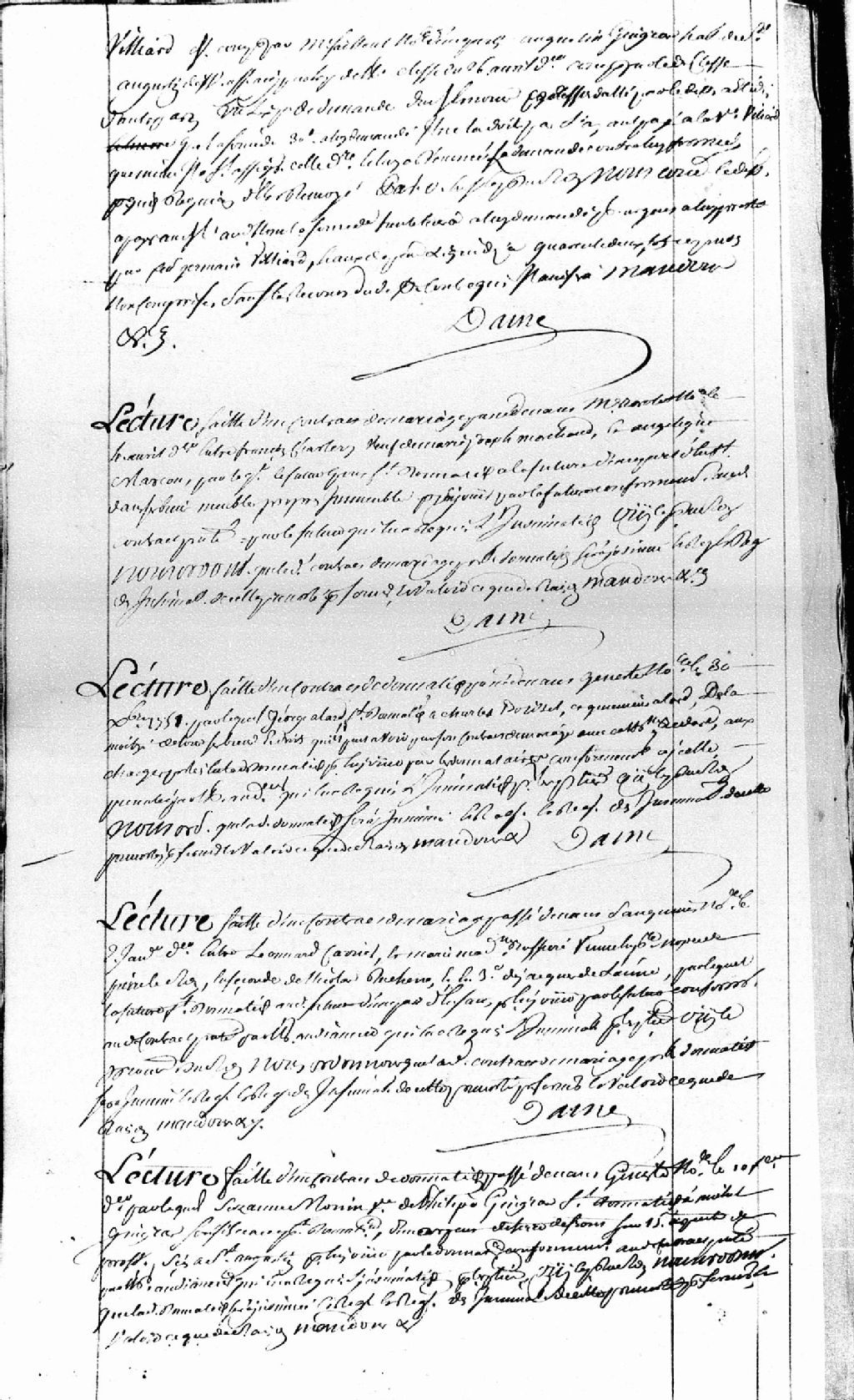 Lecture d'un contrat de donation passé devant maître Genest, notaire, le 30 décembre 1751, par lequel Georges Allard fait donation à Charles Boissel et Geneviève Allard, de la moitié de tous ses biens et droits qu'il peut avoir par son contrat de mariage avec Catherine Bédard, 2 mai 1752, Archives nationales à Québec, Fonds Prévôté de Québec, (03Q,TL1,S11,SS1,D99,P1013).