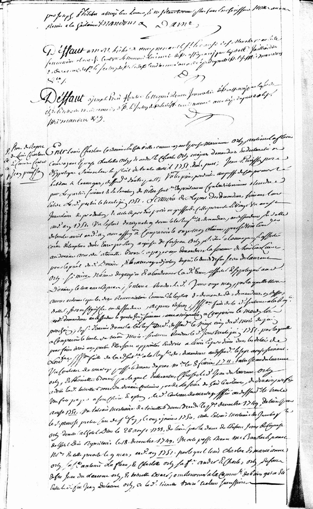 Procès de rapport entre Louis Charland, cordonnier de Québec, époux de Marie-Anne Orly (Orty), Antoine Lafleur, époux de Charlotte Orly, et André Orly et Charles Orly, demandeurs en déclaration d'hypothèque; et Jean Penisson, père, habitant de l'Auvergne, défendeur, suivent les pièces présentées par les demandeurs; un contrat de mariage passé devant maître Duprac, notaire, le 8 février 1711, entre Jean-Laurent Orly et Toinette (Antoinette) Bouré (Bouret), lequel donnait à ladite épouse un douaire de 800 livres, un extrait mortuaire de ladite Toinette Bouret, en date du 1er décembre 1749, l'extrait mortuaire de Jean-Baptiste Orty, décédé à l'Hôtel-Dieu, en date du 26 août 1733, un acte passé devant maîtres Barolet et Panet, notaires, le 9 mars 1751, par lequel Louis Charland et Marie-Anne Orly, son épouse, Antoine Lafleur et Charlotte Orly, son épouse, André Orly et Charles Orly, enfants du feu Jean Dulaurent Orly, et Toinette Bouré, qui ont renoncé à la communauté de biens qui a été entre lesdits Orly et Bouré, suit la mention des pièces du défendeur; un contrat de vente passé devant maître DuBreuil, notaire, le 29 août 1732, par lequel Jean Dulaurent l'aîné et Toinette Bouré, son épouse, ont vendu à Jean-Baptiste Penisson et Élisabeth Corbin, son épouse, une terre sise à Notre-Dame-des-Anges, les conclusions du procureur du roi en date du 28 avril 1752, ladite terre est déclaré hypothéquée du douaire susmentionné, attendu la renonciation desdits demandeurs à la succession de leurdits défunts parents, ledit défendeur est condamné à payer aux demandeurs la somme de 800 livres, en plus des intérêts, si mieux n'aime, le défendeur déguerpir de sur ladite terre, ledit défendeur est condamné aux dépens liquidés à 28 livres