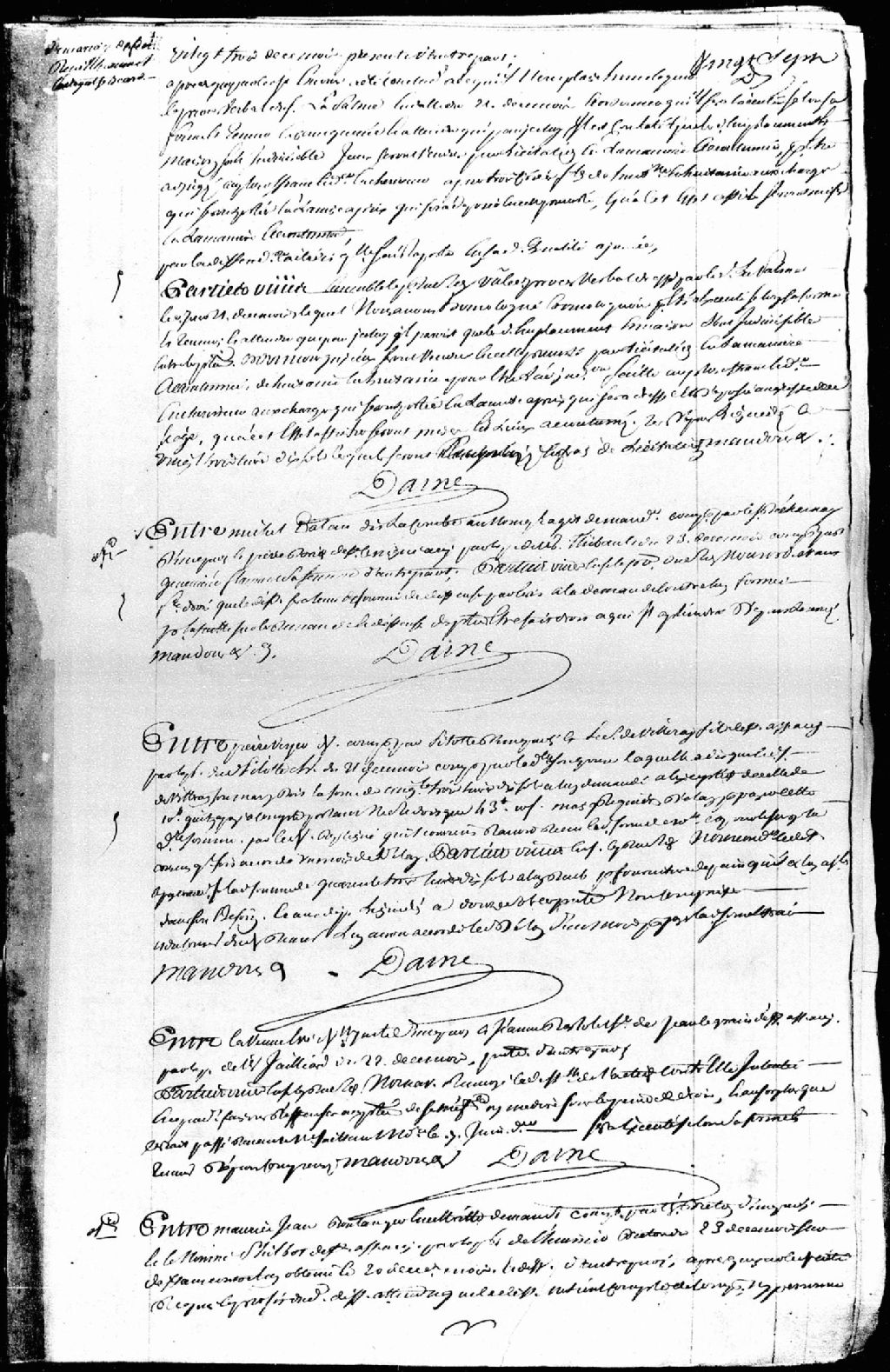 Cause entre Michel Balan dit Lacombe, demandeur, comparant par le sieur Decharnay, et Pierre Dorion, défendeur, comparant par Geneviève Flamant, son épouse, il est ordonné que le défendeur sera tenu de fournir des défenses par écrit à la demande contre lui formée, 27 juillet 1751, Archives nationales à Québec, Fonds Prévôté de Québec, (03Q,TL1,S11,SS1,D99,P193).