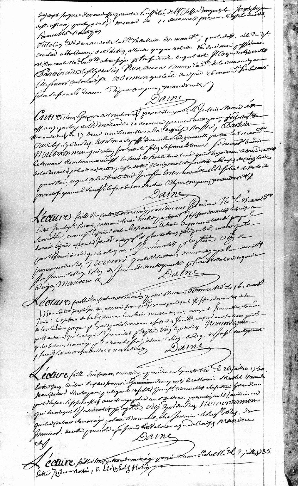 Lecture d'un contrat de mariage passé devant maître Dionne, notaire, le 25 avril 1751 entre Jean-Baptiste Perrault et Marie-Louise Ouellet, par lequel ils se font donation entre vifs au survivant d'entre eux