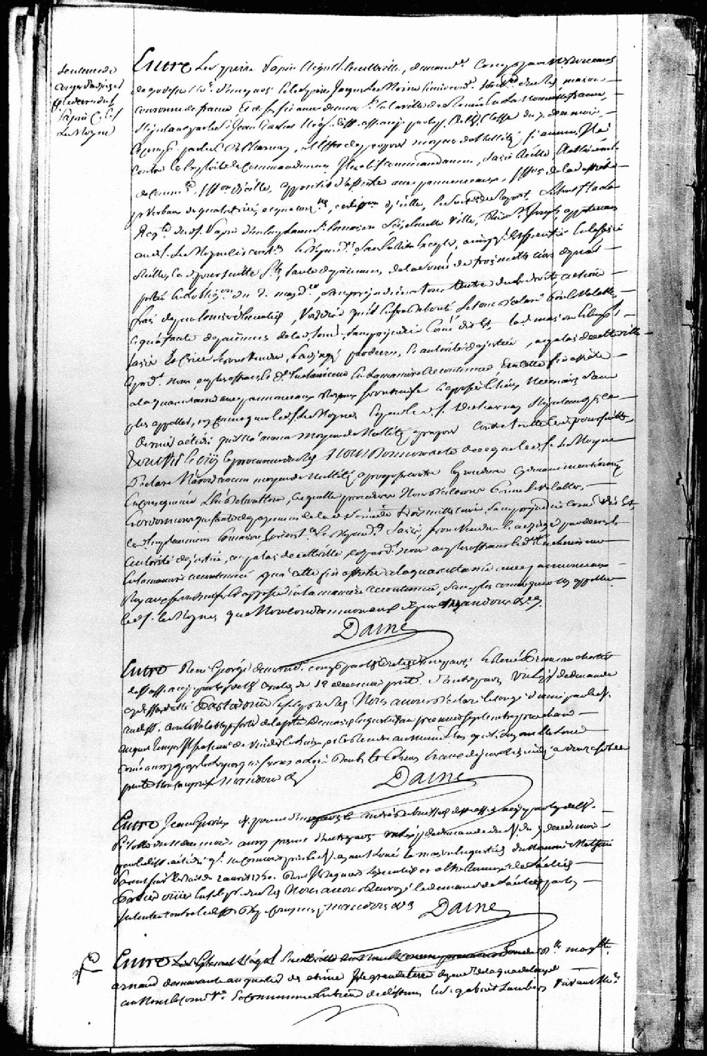 Cause entre Marguerite Arnaud, demeurant au quartier des abîmes, île de Grande-Terre, dépendante de la Guadeloupe, veuve et commune en biens du feu sieur Gabriel Lambert, de son vivant notaire audit lieu, demanderesse, stipulant par le sieur Grenet, négociant de Québec, comparant par maître Panet, notaire; et Jacques Bellerose de LaFontaine, conseiller au Conseil supérieur en Nouvelle-France, chargé des affaires de la demanderesse, défendeur, comparant par maître Dulaurent, notaire, ledit défendeur est condamné à payer à la demanderesse la somme de 3050 livres