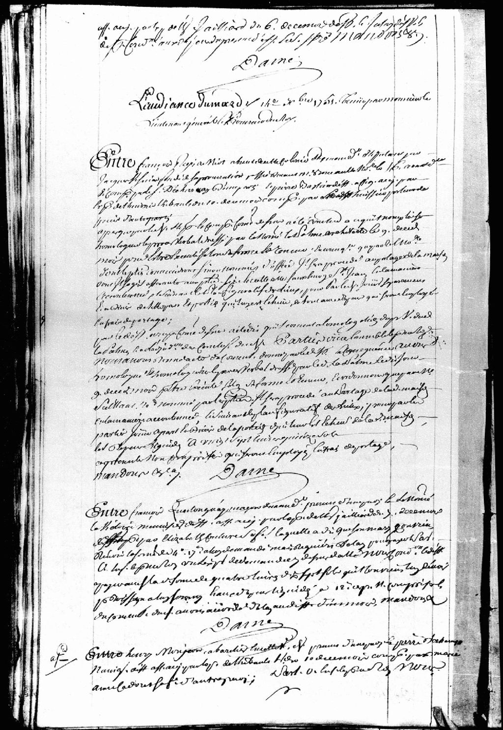 Cause entre Henry Monjeon, cabaretier de Québec, demandeur; et Pierre Decharny (Deschamps), navigateur, défendeur, comparant par Marie-Anne Cadoret, son épouse, ordre au défendeur de comparaître en personne, 14 décembre 1751, Archives nationales à Québec, Fonds Prévôté de Québec, (03Q,TL1,S11,SS1,D99,P585).