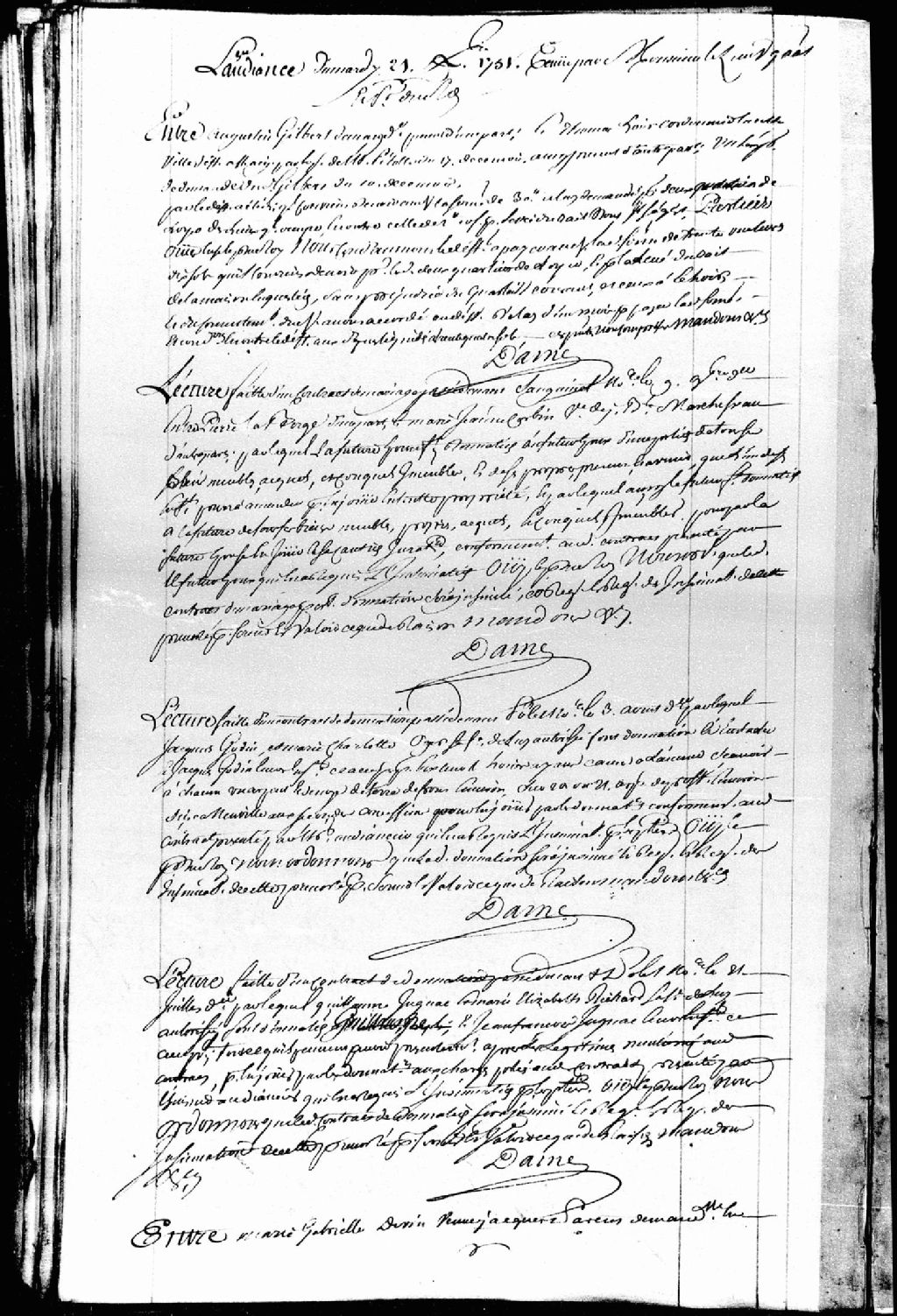 Lecture d'un contrat de mariage passé devant maître Sanguinet, notaire, le 9 novembre 1751, entre Pierre Laberge, et Marie-Jeanne Corbin, veuve du feu Jean-Baptiste Marchesseau, par lequel la future épouse fait donation à son futur époux d'une part de tous ses biens, et par lequel aussi le futur époux fait donation à sa future épouse de tous ses biens