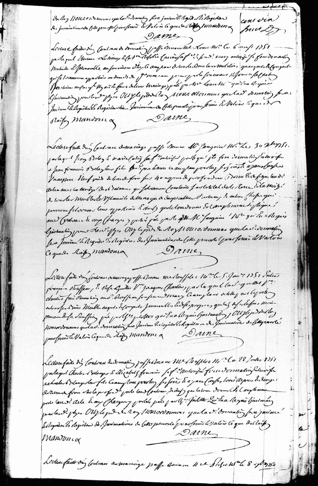Lecture d'un contrat de mariage passé devant maître Sanguinet, notaire, le 30 décembre 1751, par lequel Jean Bélan et Marie Cotin, son épouse, font donation à François Bélan, leur fils, d'une part de terre avec la moitié des bâtiments qui y sont construits et de la moitié de tous les meubles, ustensiles de ménage et d'agriculture, bestiaux et autres choses qui s'y trouvent