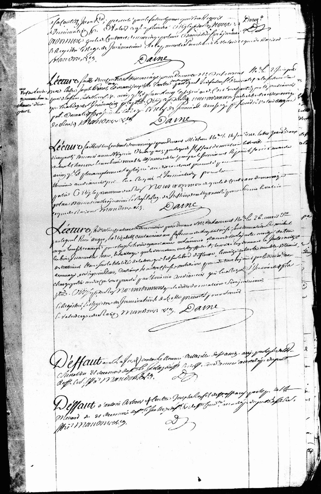 Lecture d'un contrat de mariage passé devant maître Dulaurent, notaire, le 2 juin 1751, entre Joseph Perrot (Perrault), veuf de la feue Louise-Geneviève Han dit Chaussé, et Marie-Josèphe Tartre (Letartre), par lequel le futur époux fait donation à la future épouse d'une part d'enfant en sa succession