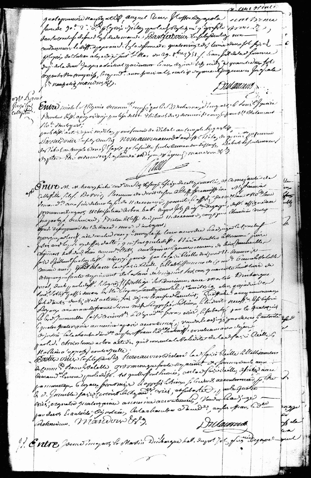 Cause entre le sieur Henri Hiché, conseiller du roi et son secrétaire au siège de la Prévôté et Amirauté de Québec, et le sieur Devoisy, receveur des droits de son Altesse sérénissime monseigneur l'Amiral, demandeurs, assistés de maître Panet, notaire; et Martin Dinhargue (Dinharque), habitant du Port-Joly en la seigneurie de Gaspé, défendeur, comparant par l'huissier Breton, mention du nommé Pierre Chouinard, habitant de Port-Joly, commissaire établis au régime et gouvernement des biens immeubles saisis sur ledit défendeur le 11 mars 1752, ladite saisie est déclarée bonne et valable, il est ordonné que faute du paiement de la somme de 5348 livres due aux demandeurs, lesdits biens saisis seront vendus et adjugés au plus offrant pur dédommager lesdits demandeurs