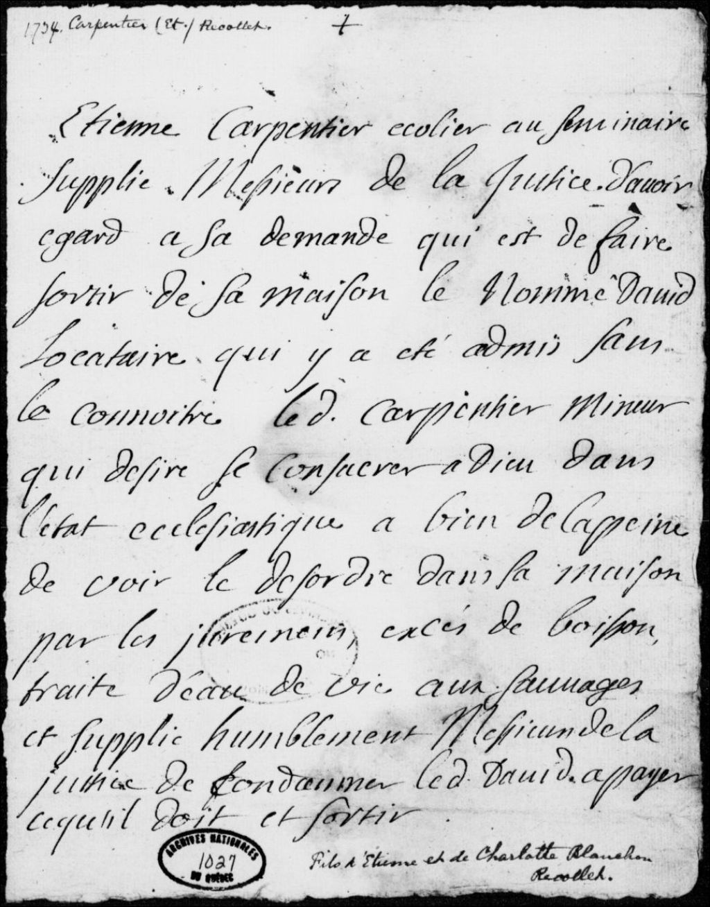 Requête d'Étienne Carpentier, mineur, écolier au Séminaire de Québec, afin qu'un nommé David, locataire de sa maison, paie son loyer et soit expulsé pour désordre, mauvaise conduite, et vente d'eau-de-vie aux Sauvages (Amérindiens)