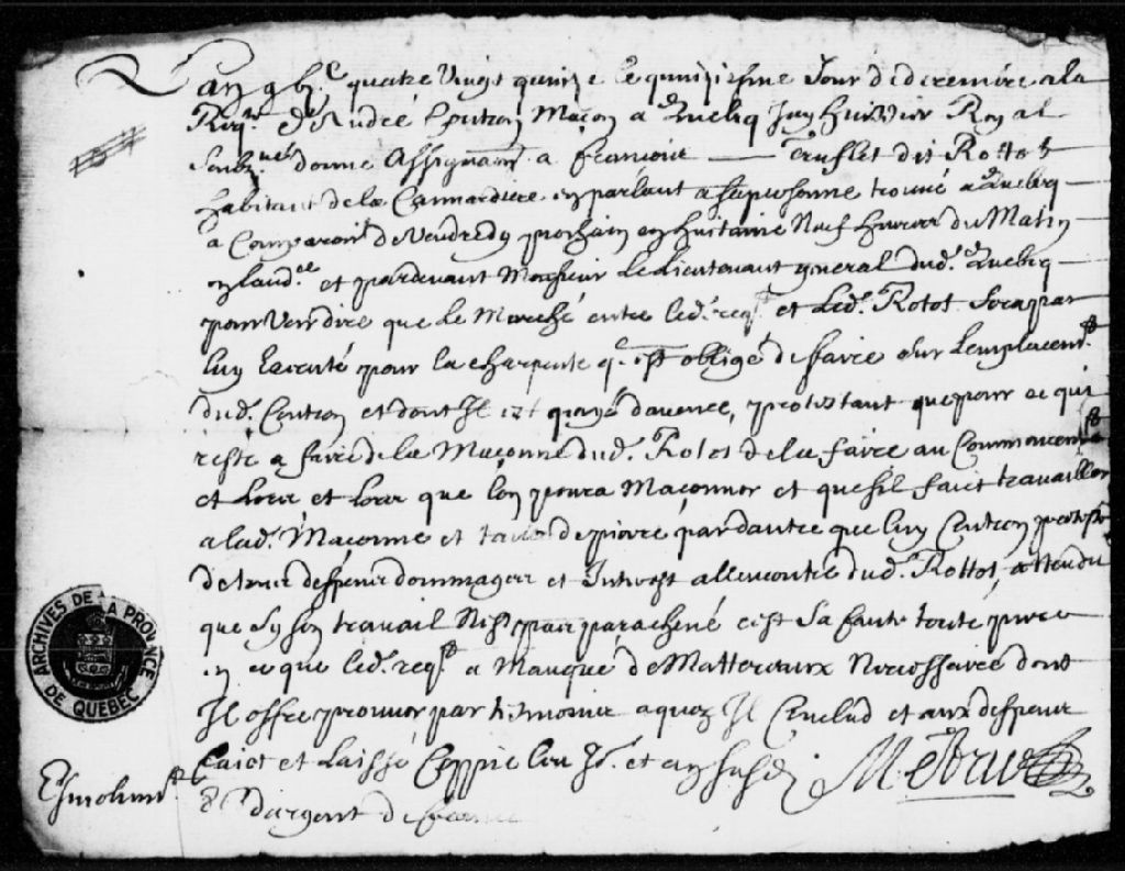 À la requête de François Trefflé dit Rottot (Rotot), habitant de la Canardière, assignation d'André Couteron (Coutron), maçon de Québec, afin qu'il paie au requérant l'exécution d'un marché de charpente, soit 9 livres pour 6 journées passées à faire du mortier, 15 décembre 1695 - 16 décembre 1695, Archives nationales à Québec, Fonds Prévôté de Québec, (03Q,TL1,S11,SS2,D104).