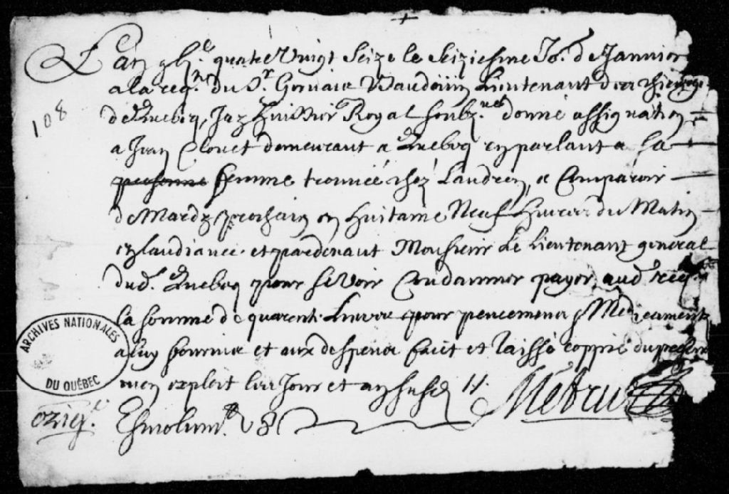 À la requête de Gervais Beaudoin, chirurgien à Québec, assignation de Jean Clouet, demeurant à Québec, afin qu'il paie 40 livres pour des pansements et des médicaments