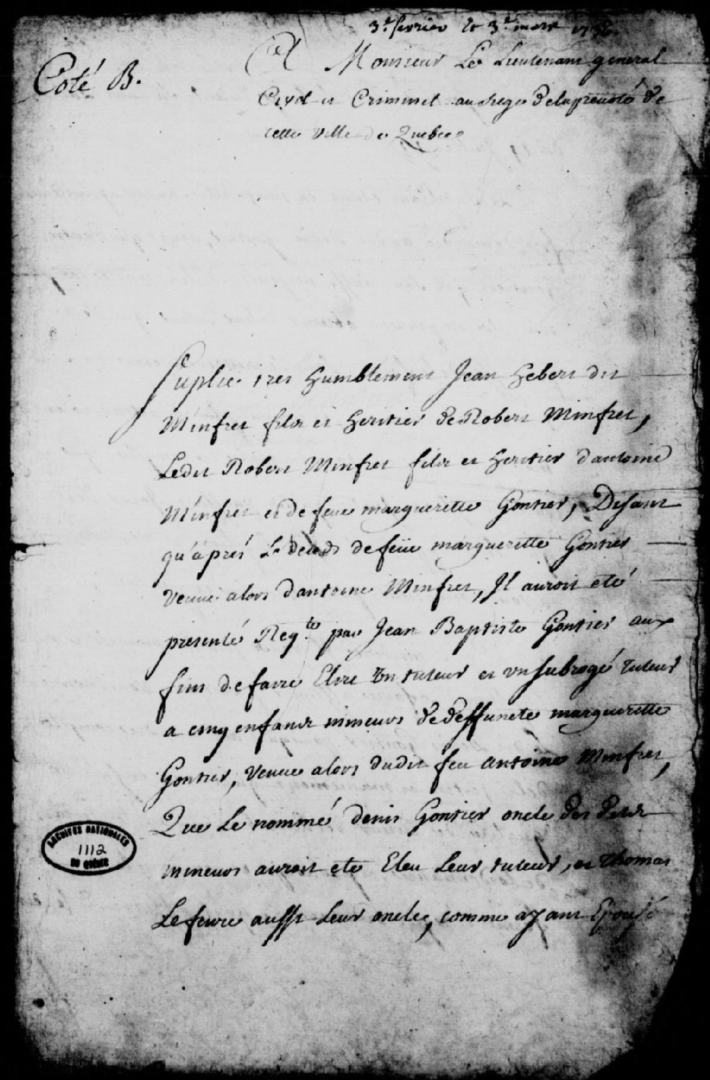 - Ce dossier comprend une requête de Jean Hébert dit Minfret pour l'assignation de Denis Gonthier, afin qu'il soit condamné à payer au suppliant, par forme de provision, la somme de 500 livres, faute d'avoir fourni le compte de gestion de sa tutelle; une ordonnance de Pierre André de Leigne pour l'assignation dudit Gonthier; un exploit de signification de la requête et de l'ordonnance, et une assignation à Denis Gonthier; une requête de Jean Hébert dit Minfret afin que Denis Gonthier, son tuteur, soit condamné à rendre compte de la gestion de sa tutelle; une ordonnance pour l'assignation dudit Gonthier; un exploit de signification de la requête et d'assignation; une sentence rendue dans le procès de Jean Hébert contre Jean-Baptiste Gonthier, au nom et comme tuteur des enfants mineurs des défunts Marguerite Gonthier et Antoine Hébert, condamnant Jean-Baptiste Gonthier à rendre compte de la gestion et du maniement qu'il a eu des biens [...]