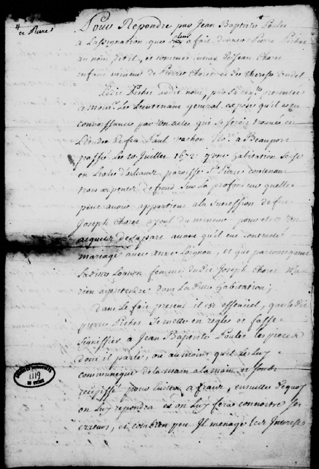 Réponse de Jean-Baptiste et Pierre Paulet, habitants de la paroisse de Saint-Pierre sur l'Île d'Orléans, à l'assignation à eux donnée suivant la requête de Pierre Pichet, au nom et comme tuteur de Jean Choret, enfant mineur de Pierre Choret et de Thérèse Trudel, lesdits Paulet enjoignant le sieur Pichet de leur communiquer les pièces et documents relatifs à une habitation de trois arpents de front sise en ladite paroisse de Saint-Pierre, et dont Pierre Pichet prétend qu'elle appartient à la succession de feu Joseph Choret, aïeul dudit mineur, et non à sa veuve Anne Loignon, épouse en secondes noces d'Antoine Paulet, et exploit de signification de ladite réponse à Pierre Pichet, 7 avril 1736, Archives nationales à Québec, Fonds Prévôté de Québec, (03Q,TL1,S11,SS2,D1119).