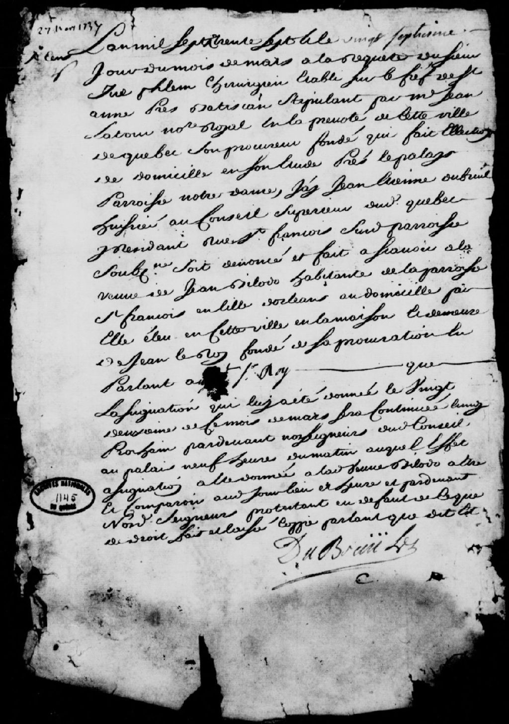 À la requête d'Yves Flemme (Phlem), chirurgien, établi sur le fief de Sainte-Anne près de Bastican, stipulant par maître Latour, notaire royal en la Prévôté de Québec, déclaration à la veuve de Jean Bilodeau, habitante de la paroisse de Saint-François sur l'Île d'Orléans, pour lui faire savoir que l'assignation du 22 mars sera continuée