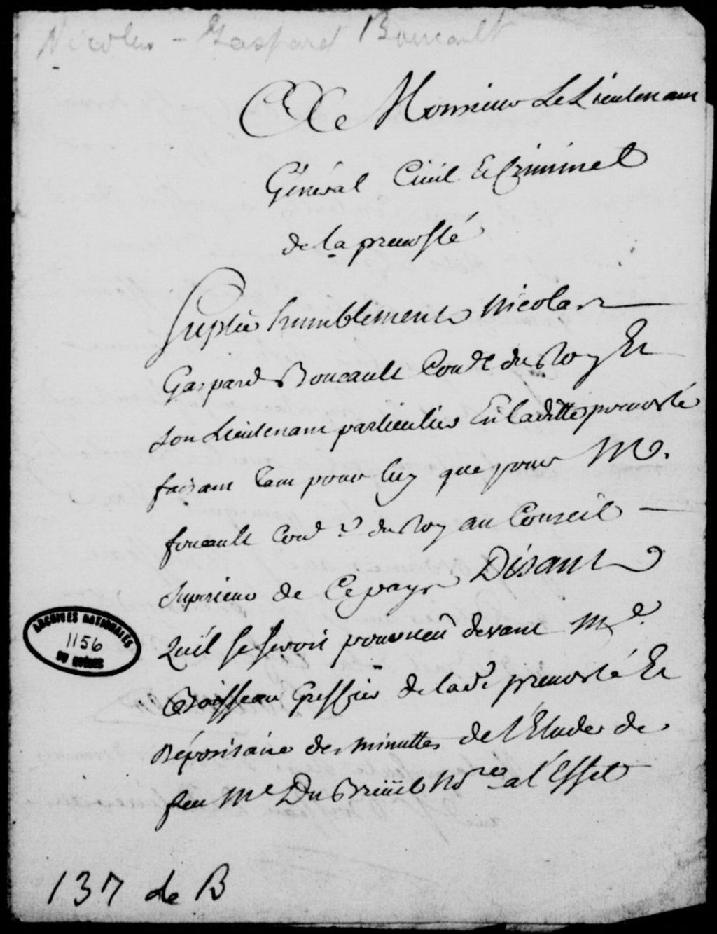 Requête de Nicolas-Gaspard Boucault, lieutenant particulier de la Prévôté de Québec, faisant tant pour lui que pour le sieur Foucault, conseiller du Roi au conseil supérieur de Québec, afin que maître Boisseau, greffier de la Prévôté de Québec, Iui donne l'expédition du bail passé devant feu maître Dubreuil, le 4 novembre 1732, par le sieur Pierre Constantin au profit des sieurs Rotot (Trefflé) et Hamel, et ordonnance d'André de Leigne enjoignant au greffier Boisseau de délivrer ledit bail à Boucault, moyennant salaire