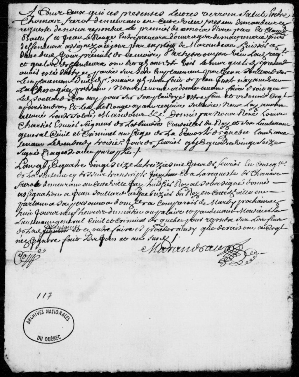 Procès de Thomas Frérot, demeurant à Québec, contre les entrepreneurs en maçonnerie Claude Baillif et Jean Lerouge au sujet d'un mur bâti sur l'emplacement dudit Frérot, et assignation de Jean Soulard à la requête dudit Frérot, 3 février 1696, Archives nationales à Québec, Fonds Prévôté de Québec, (03Q,TL1,S11,SS2,D117).