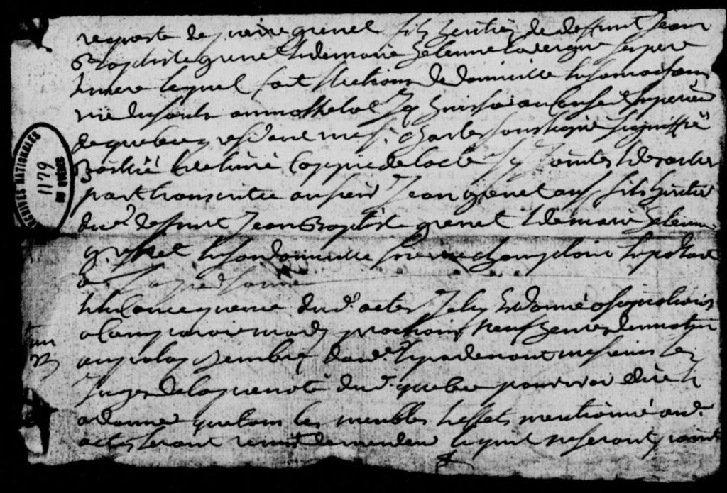Prêt de Pierre Grenet à Jean-Baptiste Grenet et Marie-Hélène Lavergne, ses père et mère, de tout un ameublement et d'une certaine somme d'argent, ledit Pierre Grenet se réservant le droit de récupérer les effets prêtés, et signification à Jean Grenet, frère dudit Pierre Grenet, aussi héritier de leurs père et mère, du prêt avec ses conditions, ainsi que de son droit de le récupérer directement de la communauté de ses père et mère avant le partage de la succession, 12 avril 1740 - 12 mars 1745, Archives nationales à Québec, Fonds Prévôté de Québec, (03Q,TL1,S11,SS2,D1179).