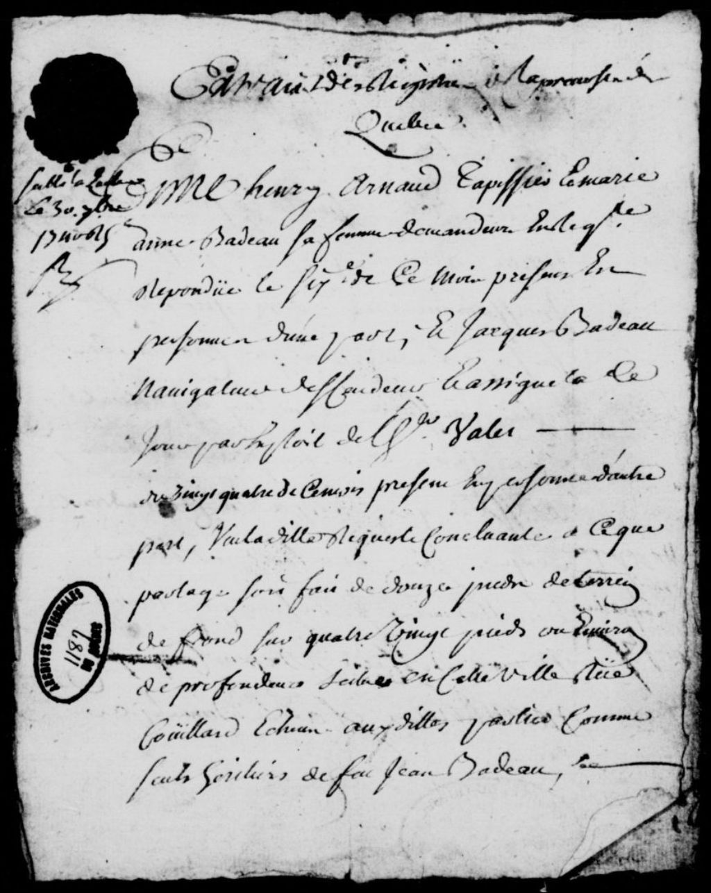 Sentence rendue dans le procès entre Henri Arnaud, tapissier de Québec, demeurant sur la rue Couillard, époux de Marie-Anne Badeau, et Jacques Badeau, navigateur, de Québec, à l'effet que les parties se partageront le terrain appartenant à feu Jean Badeau, situé rue Couillard, dont elles ont hérité, après la nomination d'experts, et exploit de signification de ladite sentence à Jacques Badeau, à qui est réclamée la somme de 3 livres et 16 sols pour les frais encourus selon le mémoire annexé