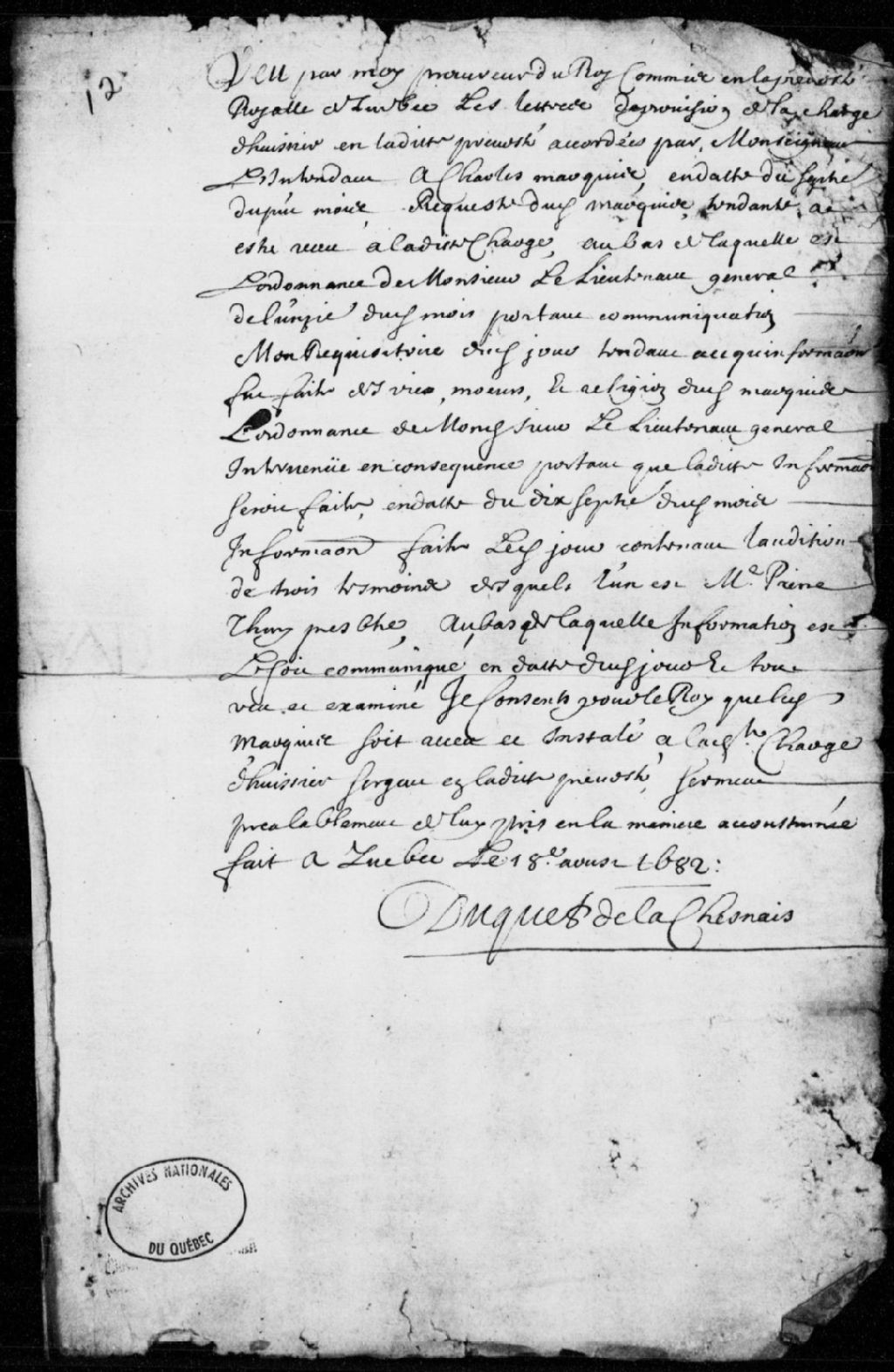 Nomination de Charles Marquis (LeMarquis) au poste d'huissier sergent à la Prévôté de Québec, par le procureur du Roi et commis en la Prévôté de Québec