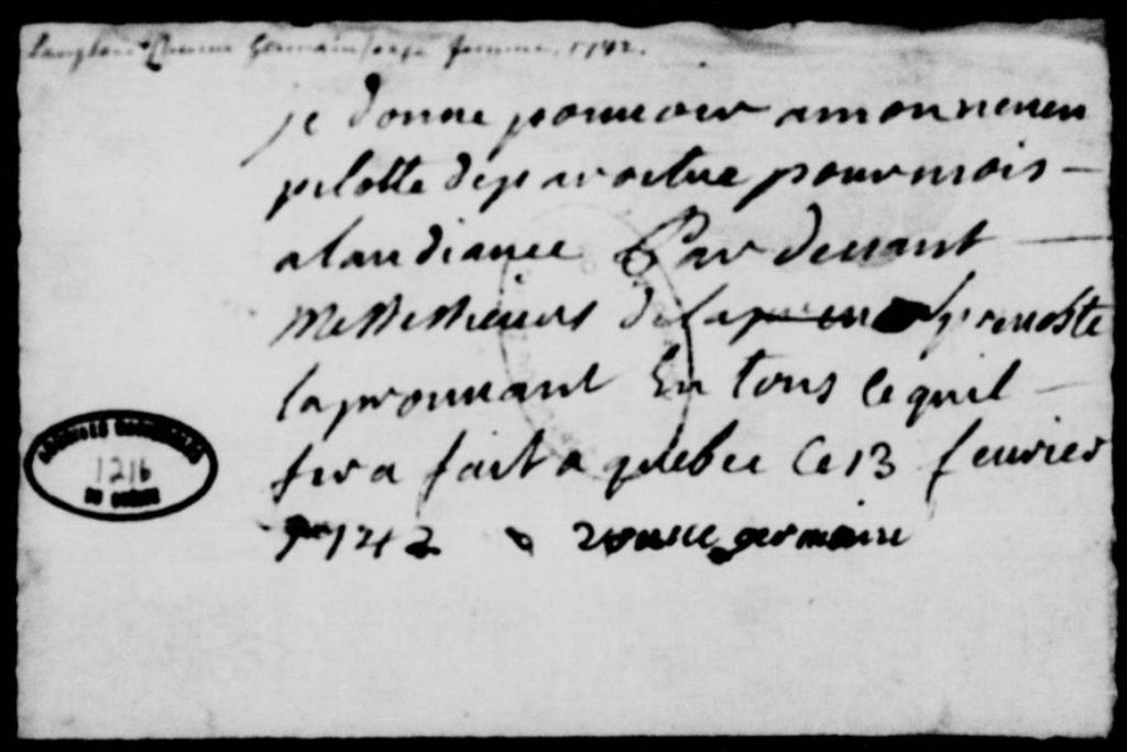 Procuration donnée par la veuve Germain à son neveu, Pilote, pour agir en son nom à l'audience