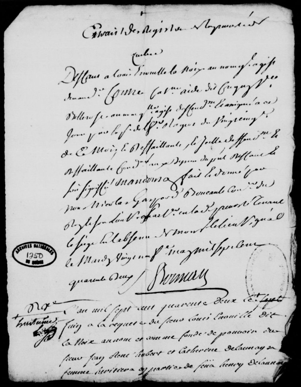 Défaut accordé par Nicolas-Gaspard Boucault, lieutenant particulier, à Louis Énouille dit Lanoix (Lanoie) contre Catherine Créquy, veuve de Pierre Jourdain dit Bellerose, assignée et condamnée aux dépens, suivi d'un exploit de signification dudit défaut et d'une assignation à ladite veuve, 29 mai 1742 - 8 juin 1742, Archives nationales à Québec, Fonds Prévôté de Québec, (03Q,TL1,S11,SS2,D1250).