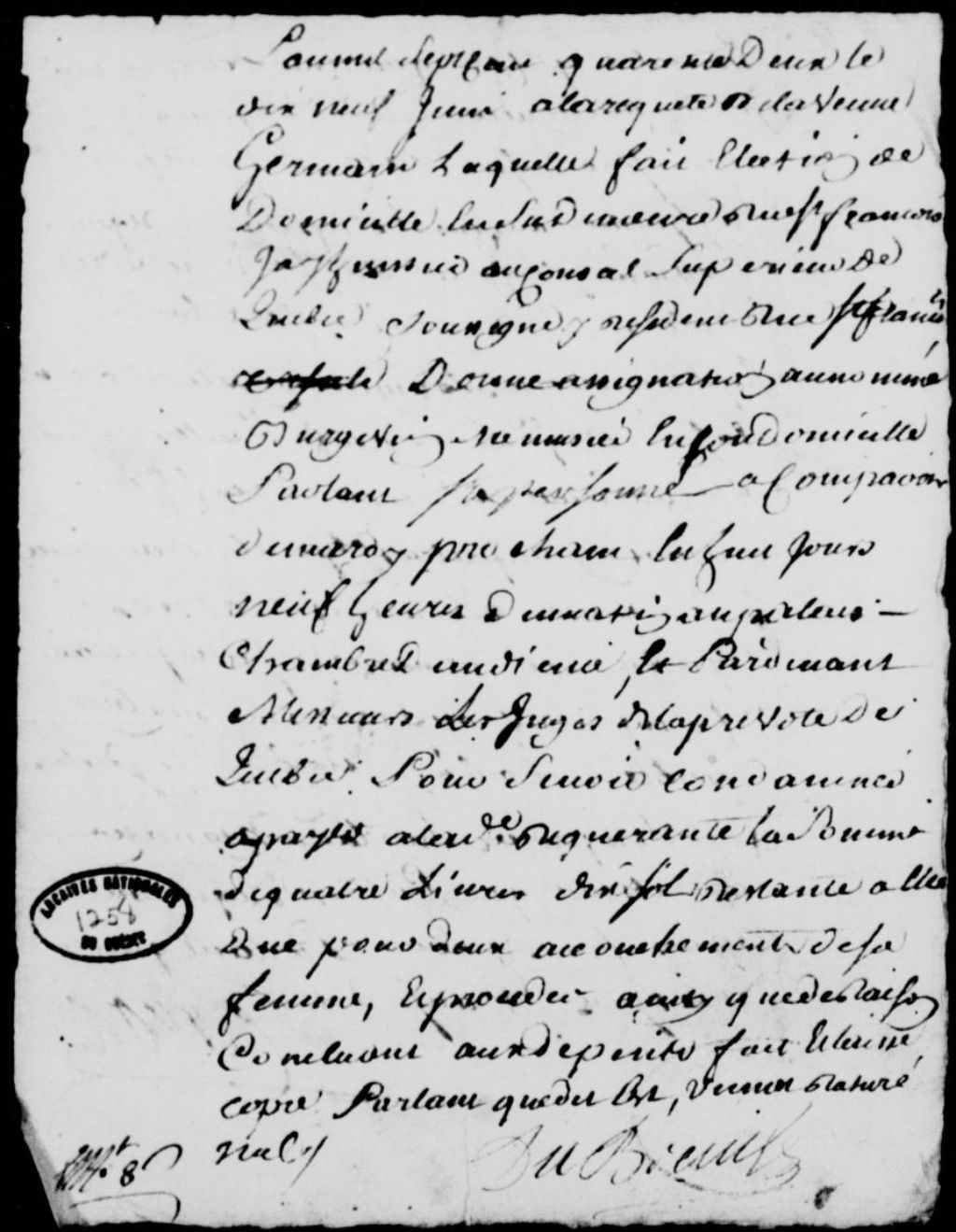 À la requête de la veuve Germain, domiciliée rue Saint-François, assignation du nommé Bergevin, menuisier, afin qu'il paie à la requérante les 4 livres et 10 sols qu'il lui doit pour deux accouchements de sa femme, avec dépens, suivie d'une déclaration pour faire savoir audit Bergevin que l'assignation du 19 juin sera continuée, 19 juin 1742 - 5 juillet 1742, Archives nationales à Québec, Fonds Prévôté de Québec, (03Q,TL1,S11,SS2,D1258).