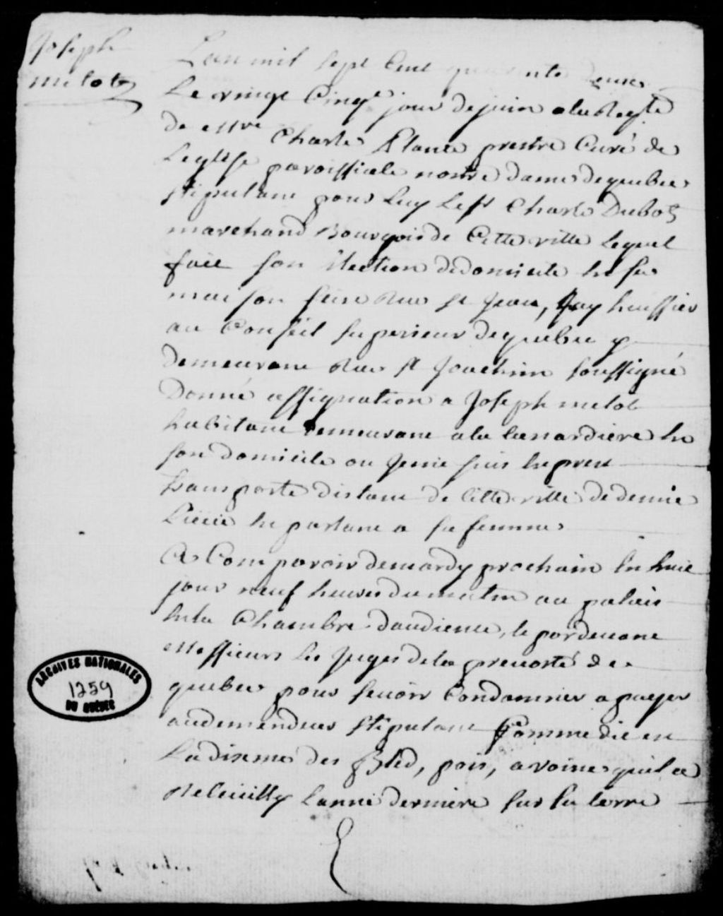 À la requête de Charles Plante, prêtre, curé de l'église paroissiale de Notre-Dame-de-Québec, stipulant par Charles Dubeau, marchand bourgeois de Québec, domicilié rue Saint-Jean, assignation de Joseph Méthot (Métot), habitant demeurant à la Canardière, afin qu'il paie le dixième de sa dernière récolte (blé, pois, avoine) recueillie sur la terre de la fabrique