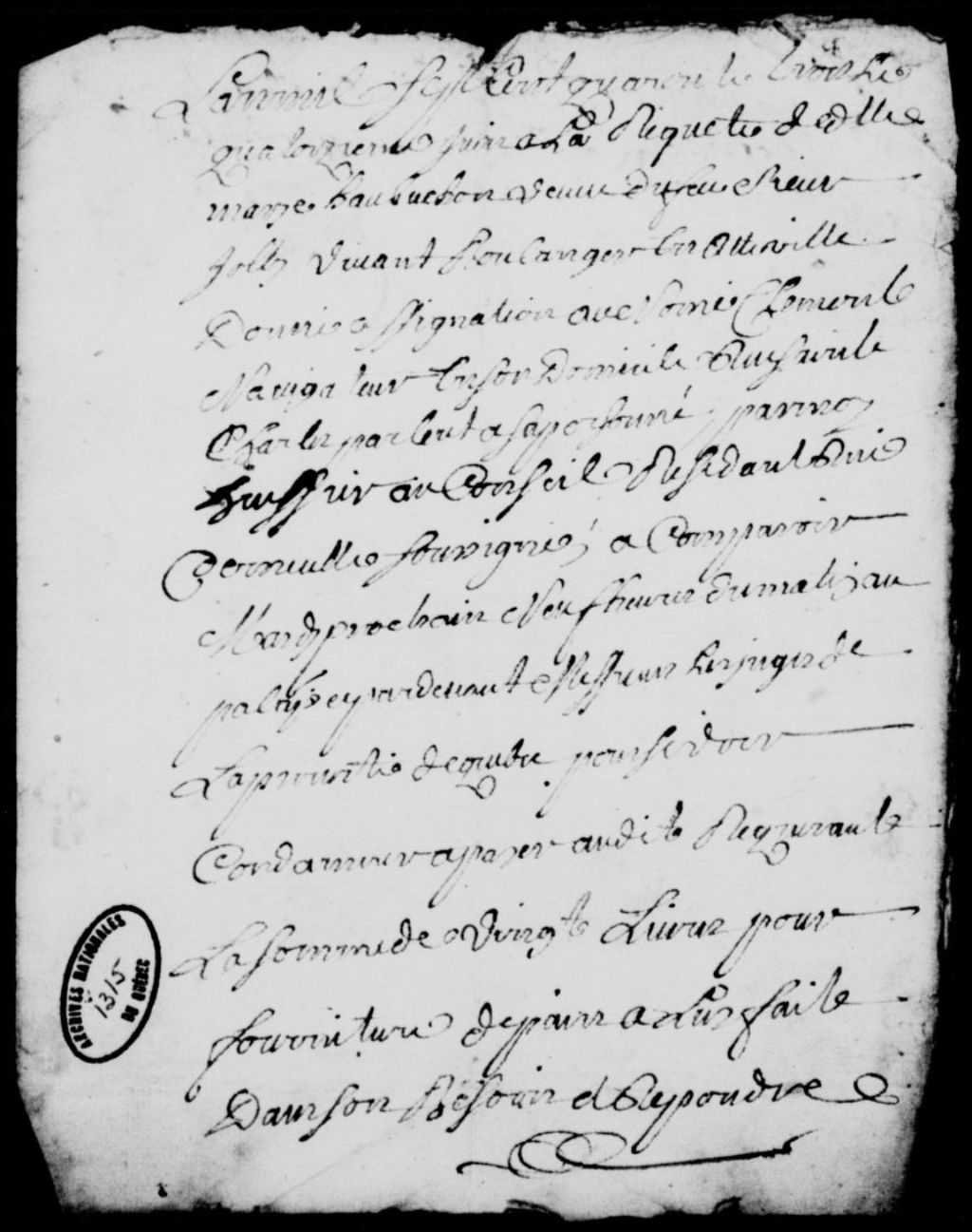 À la requête de Marie Aubuchon, veuve du sieur Joly, de son vivant boulanger de Québec, assignation du nommé Clermont, navigateur, domicilié rue Saint-Charles à Québec, afin qu'il paie à la requérante 20 livres pour fourniture de pain, avec dépens, 14 juin 1743, Archives nationales à Québec, Fonds Prévôté de Québec, (03Q,TL1,S11,SS2,D1315).