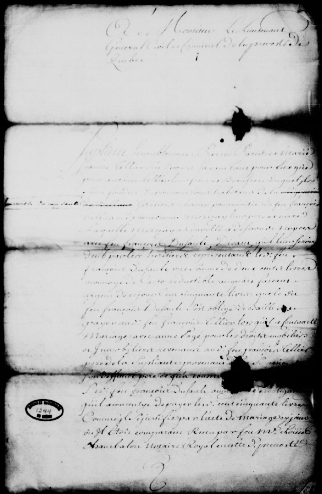 Requête de Pierre Paris et de Marie-Jeanne Tellier, son épouse, demeurant dans la paroisse de Sainte-Famille du Cap-Santé, faisant tant pour eux que pour Antoine Tellier, leur beau-frère et frère, héritiers pour moitié de la succession de feu François Tellier et de Geneviève Mezeray, leurs père et mère, laquelle a convolé en secondes noces avec feu François Dussault, pour faire assigner Jean-Baptiste Dussault, tuteur des enfants mineurs de feu Denis Dussault, de son vivant fils et donataire dudit défunt François Tellier, afin de récupérer les 150 livres qui leur reviennent selon certains arrangements de mariage et par droits d'héritage, ordonnance pour l'assignation de Jean-Baptiste Dussault, et exploit de signification de ladite requête et de l'ordonnance audit Jean-Baptiste Dussault, avec assignation, 22 février 1744, Archives nationales à Québec, Fonds Prévôté de Québec, (03Q,TL1,S11,SS2,D1344).
