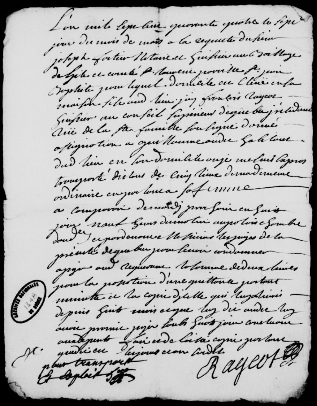 À la requête de Joseph Fortier, notaire et huissier au bailliage de l'Île d'Orléans, paroisse de Saint-Jean, assignation de Guillaume Gaudet, habitant du même lieu, afin qu'il paie au requérant la somme de 2 livres pour la passation d'une quittance, 7 mars 1744, Archives nationales à Québec, Fonds Prévôté de Québec, (03Q,TL1,S11,SS2,D1348).