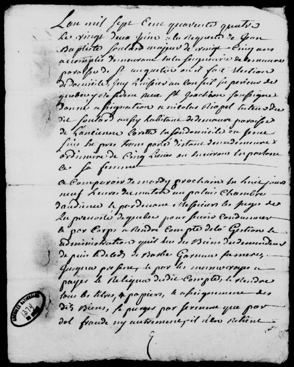 À la requête de Jean-Baptiste Soulard, majeur de 25 ans acccomplis, habitant de la seigneurie de Maure, paroisse de Saint-Augustin, assignation de Nicolas Riopel, tuteur dudit Soulard, aussi habitant de ladite seigneurie de Maure, paroisse de l'Ancienne-Lorette, afin qu'il rende compte de la gestion et de l'administration des biens de feue Barbe Garneau, mère du requérant, et, par les mêmes voies, qu'il paie le reliquat dudit compte et rende tous les papiers et titres, sans fraude