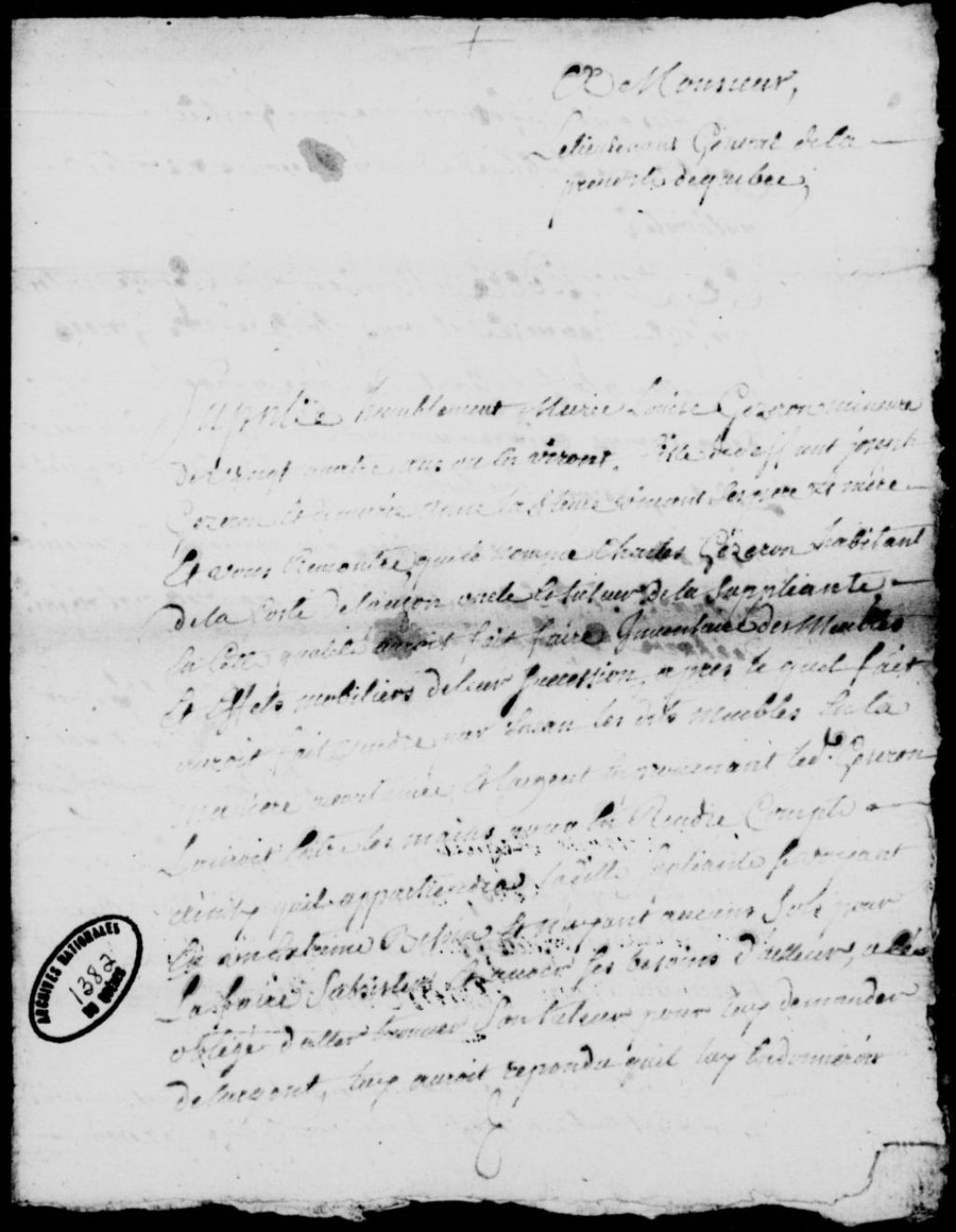 Requête de Louise Gesseron, mineure de 24 ans, fille des défunts Joseph Gesseron et Marie-Anne Pélisson dit Lafleur, pour faire assigner Charles Gesseron, habitant de la côte de Lauzon, son oncle et tuteur, afin qu'il lui accorde de quoi vivre à même l'inventaire déjà fait des biens de ses parents, ce que ledit oncle et tuteur refuse jusqu'à ce que la justice en ait décidé, suivie d'une ordonnance pour faire assigner, et d'un exploit de signification desdites requête et ordonnance à Charles Gesseron, 9 septembre 1744 - 21 septembre 1744, Archives nationales à Québec, Fonds Prévôté de Québec, (03Q,TL1,S11,SS2,D1382).