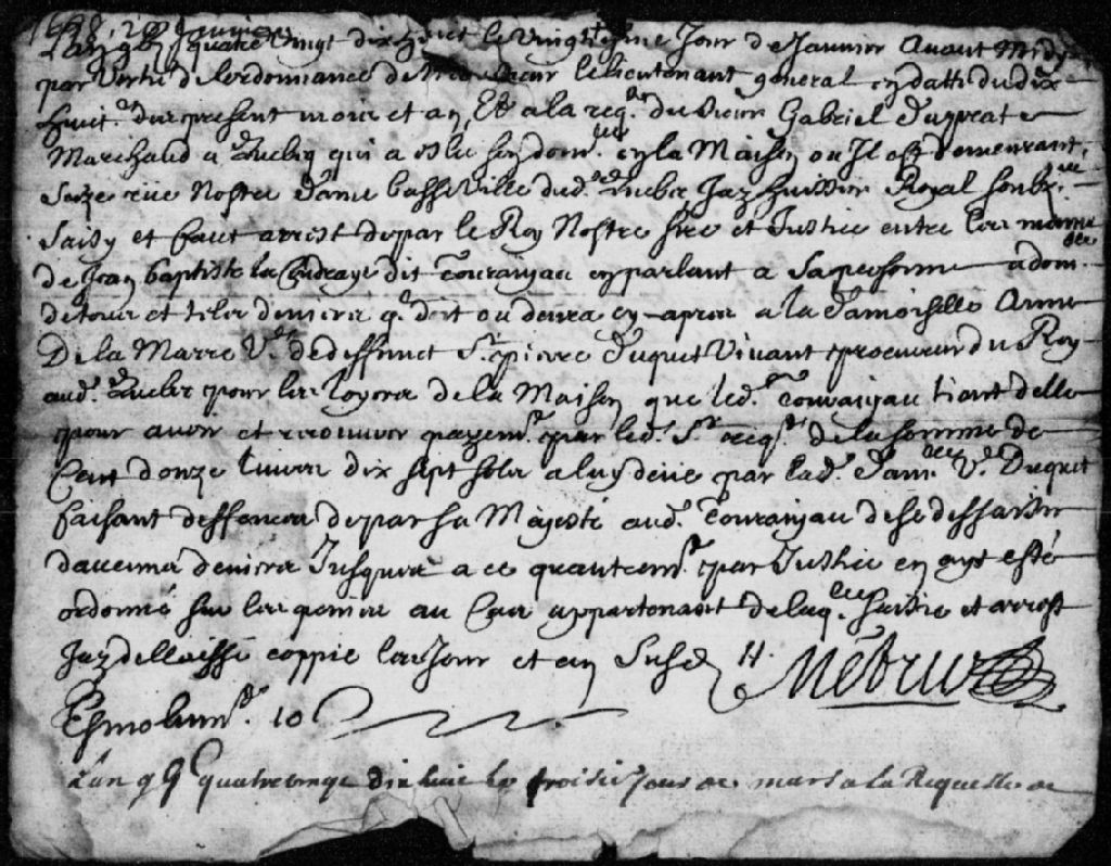 Requête de Gabriel Duprat, marchand à Québec, afin que Jean-Baptiste Lacoudray dit Tourangeau garde en ses mains ce qu'il doit à Anne Lamarre, veuve de Pierre Duquet, de son vivant procureur du Roi, pour des loyers, pour que le sieur Duprat se paie à même cela de ce qui lui est dû par ladite veuve Duquet, et signification audit Tourangeau, 20 janvier 1698, Archives nationales à Québec, Fonds Prévôté de Québec, (03Q,TL1,S11,SS2,D142).