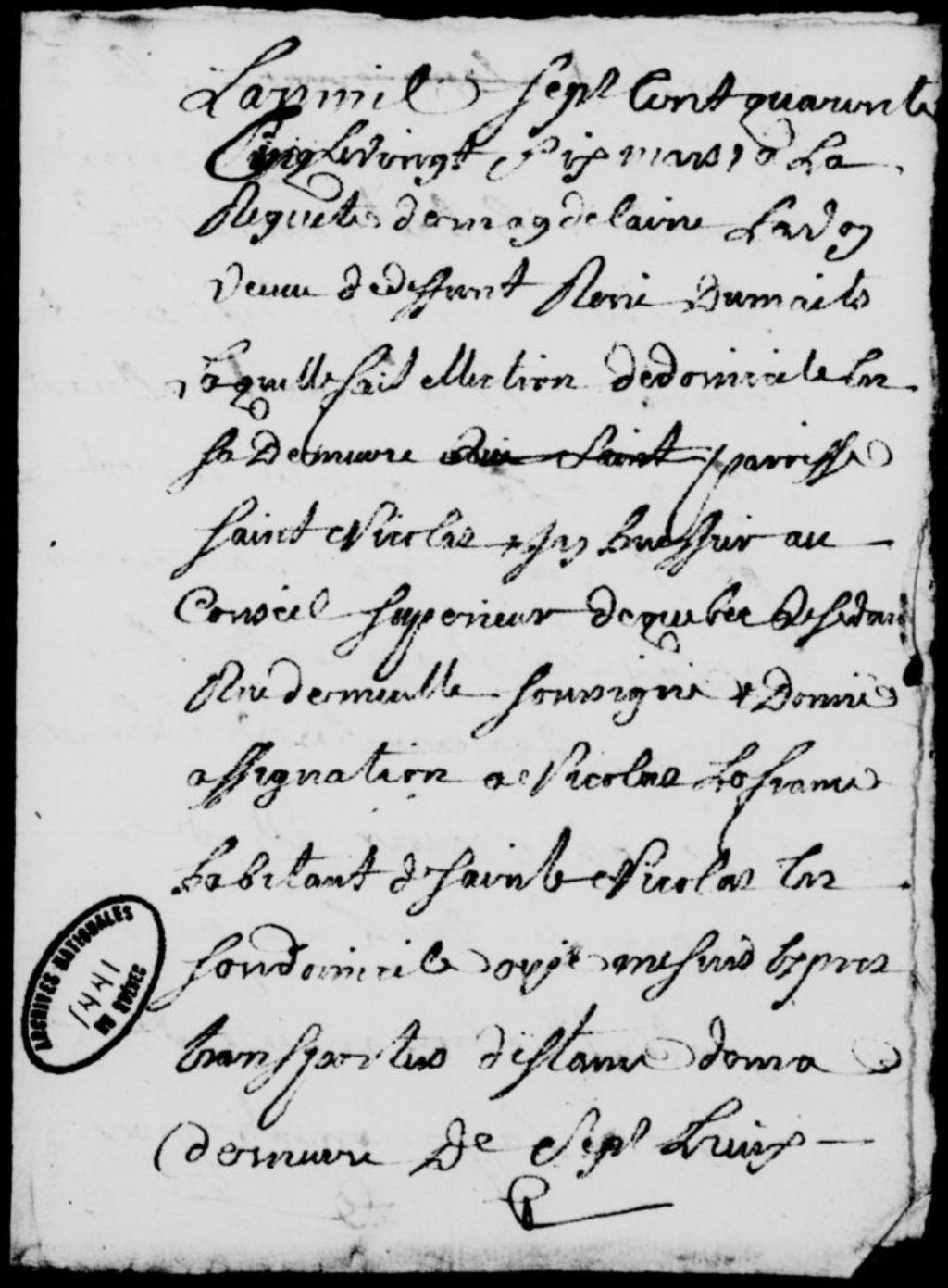 À la requête de Madeleine Lavoie, veuve de René Demers (Dumais), domiciliée en la paroisse de Saint-Nicolas, assignation de Nicolas Lafrance, habitant du même lieu, afin qu'il paie à la requérante 41 livres pour le reste de ses trois années de loyer, et 10 sols pour des vitres brisées, avec dépens, 26 mars 1745, Archives nationales à Québec, Fonds Prévôté de Québec, (03Q,TL1,S11,SS2,D1441).